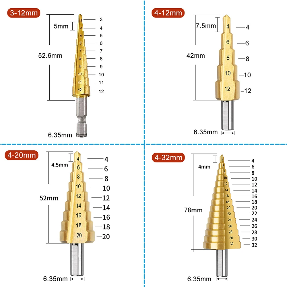 Ступенчатое сверло из быстрорежущей стали с прямым пазом, по дереву и металлу с титановым покрытием, набор инструментов для сверления сердечника, 4 модели, 3-12 4-12 4-20 4-32