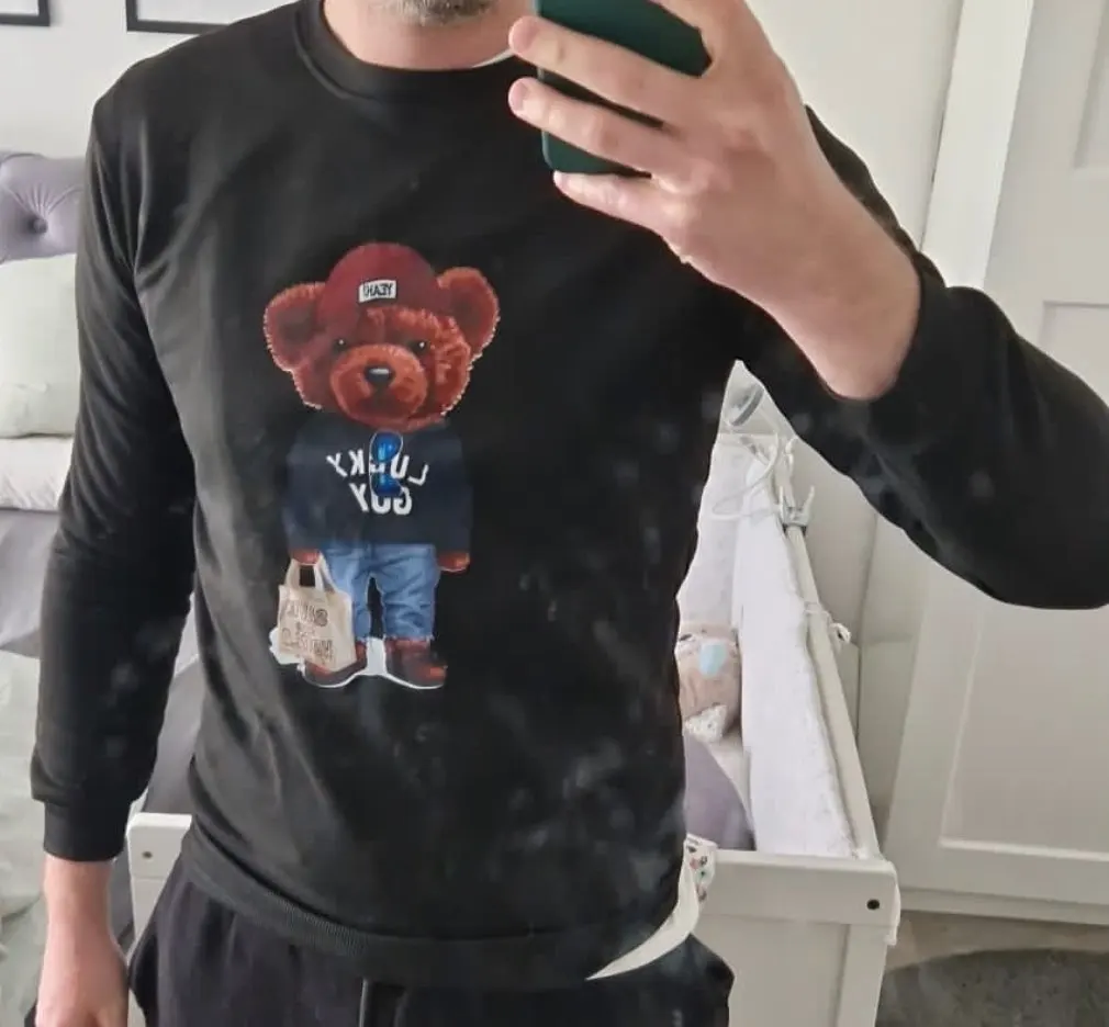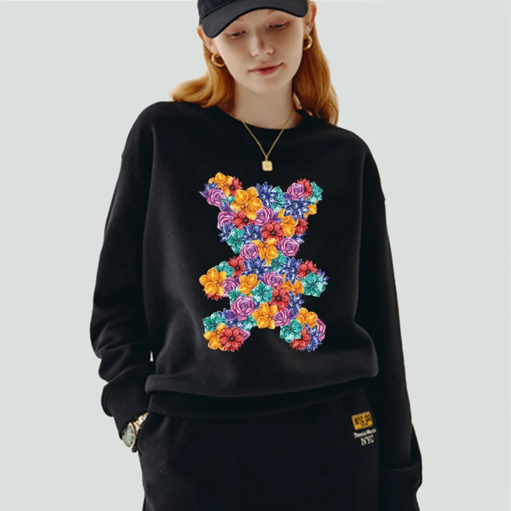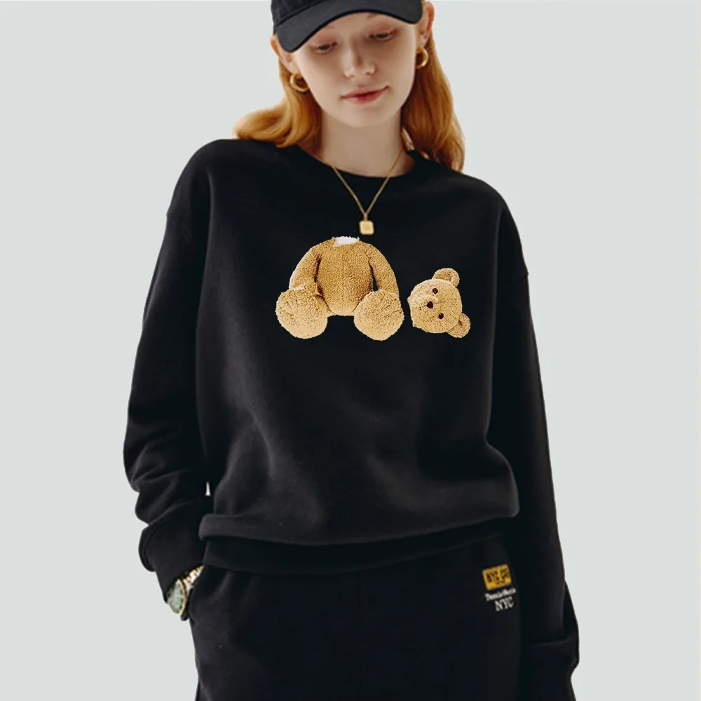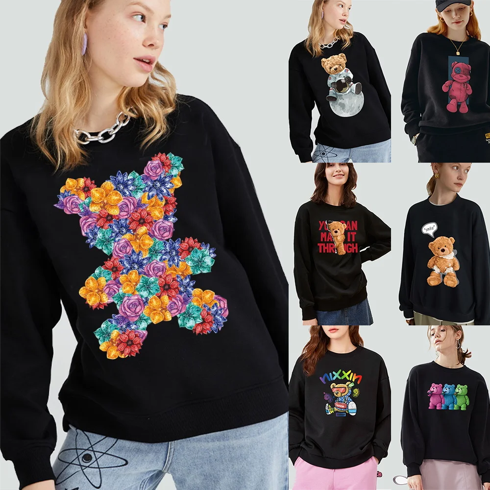 Женская толстовка с длинным рукавом, теплый Повседневный пуловер, серия с милым принтом мишки тедди, с круглым вырезом, осенняя модная черная толстовка