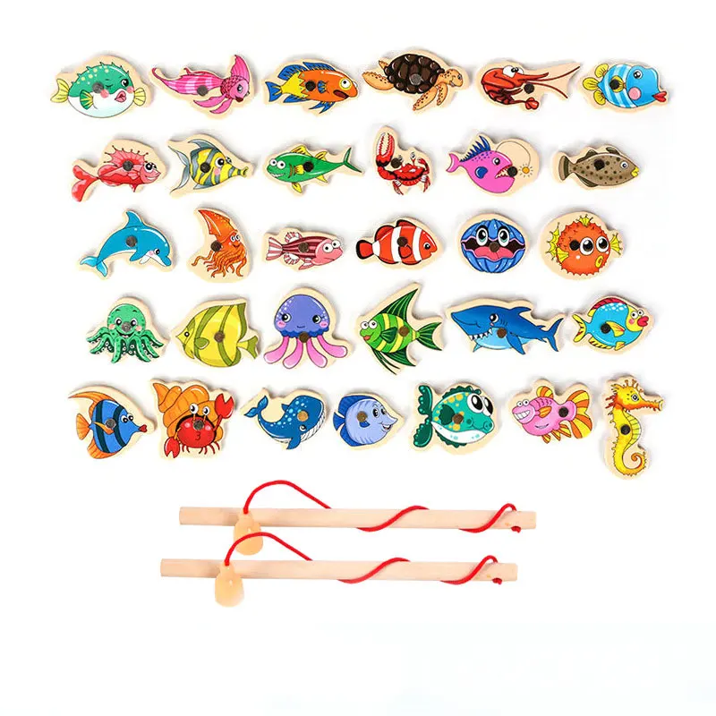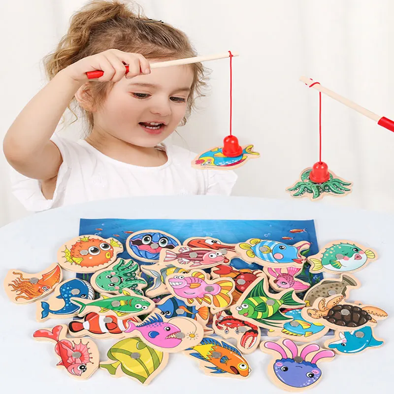 Деревянная Магнитная рыболовная игра, мультяшная Морская жизнь, познавательная удочка, игрушки для детей, раннее развивающее интерактивное устройство для родителей и детей