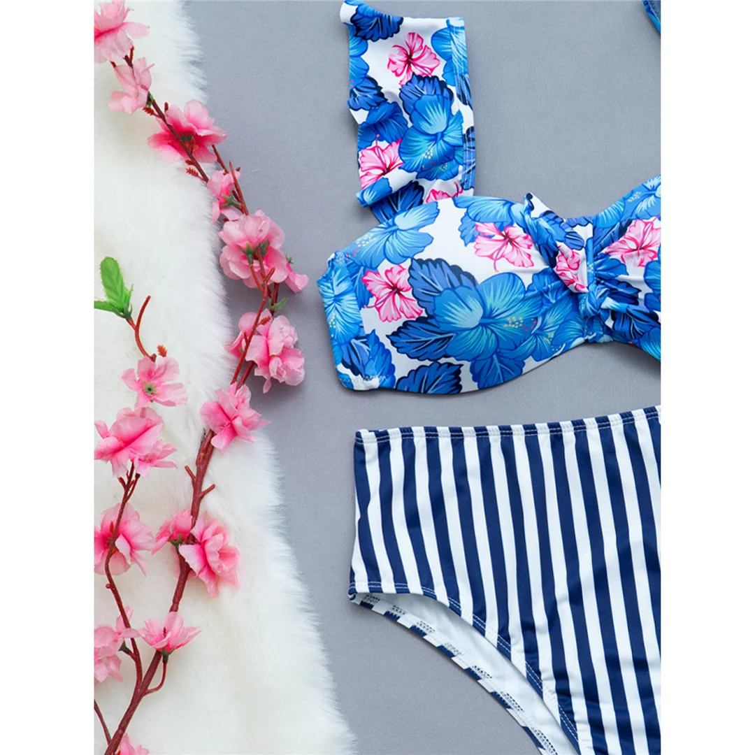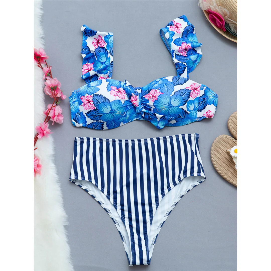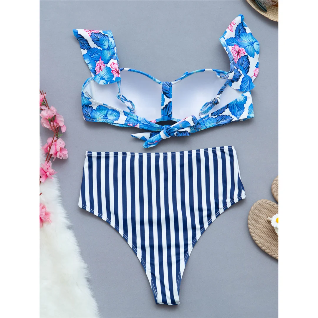 Бикини женское пуш-ап в полоску с завышенной талией и бантом спереди