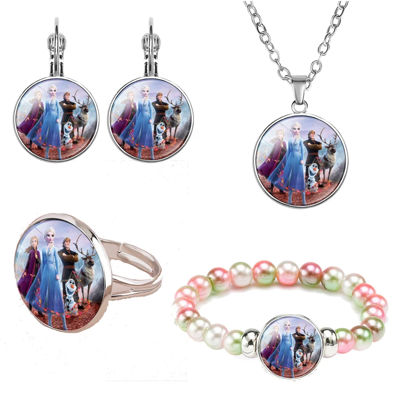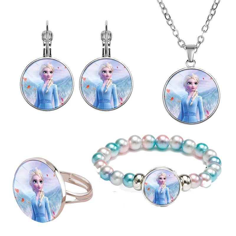 4 шт.лот Disney Frozen2, подарок на день рождения Эльзы Анны принца, детское кольцо из сплава для девочек, ожерелье, браслет, серьги, подарок вечерние ринку, подарки для девочек