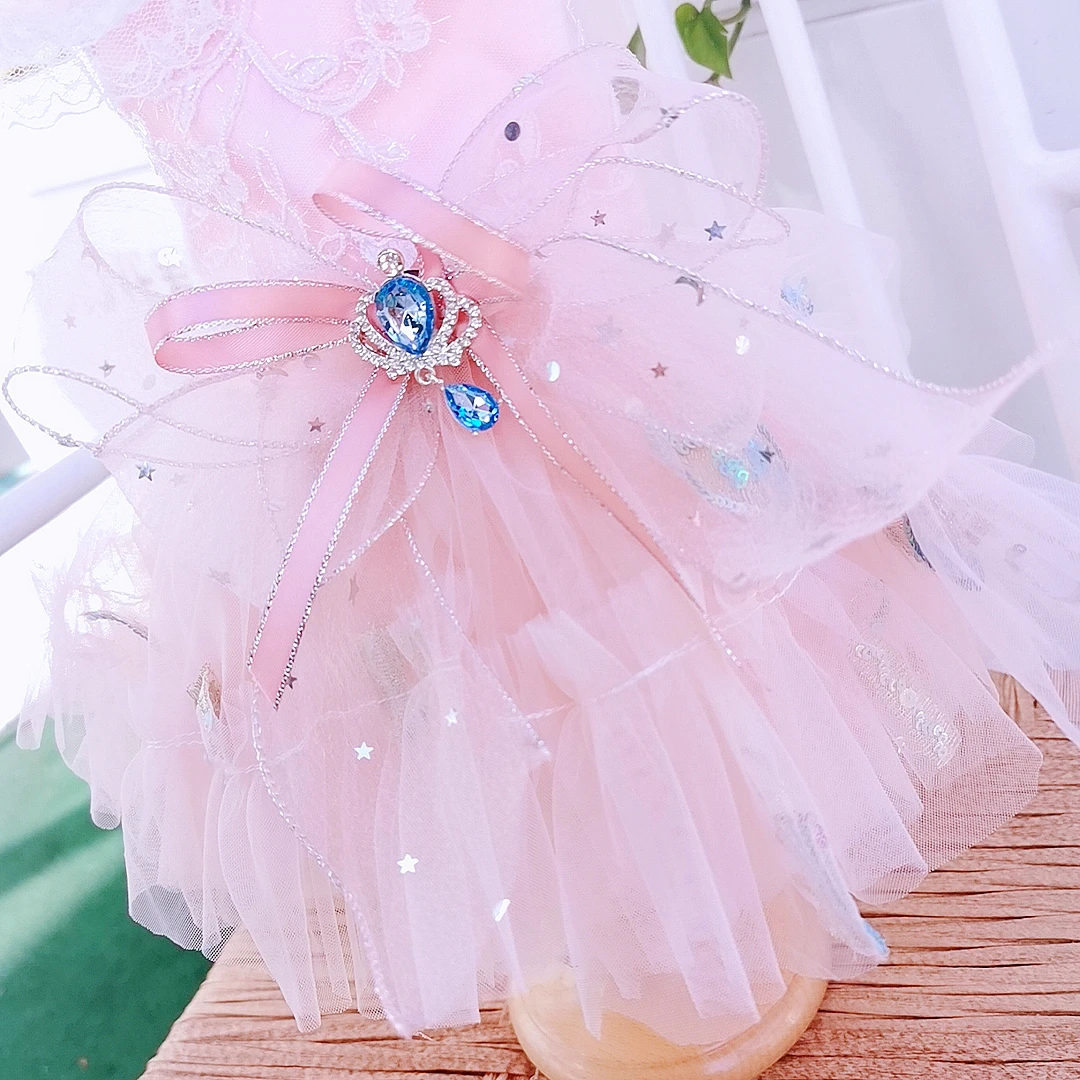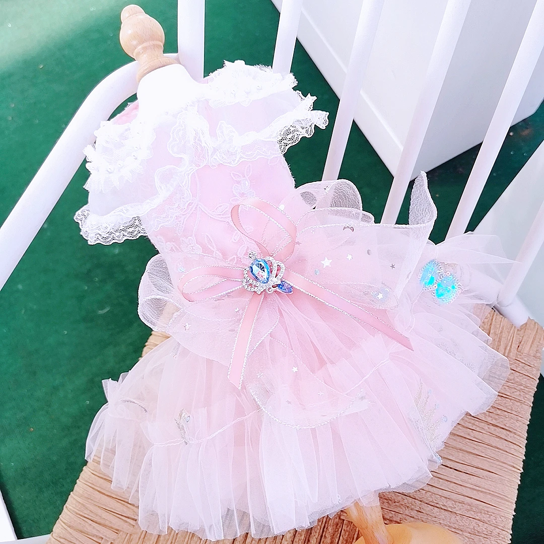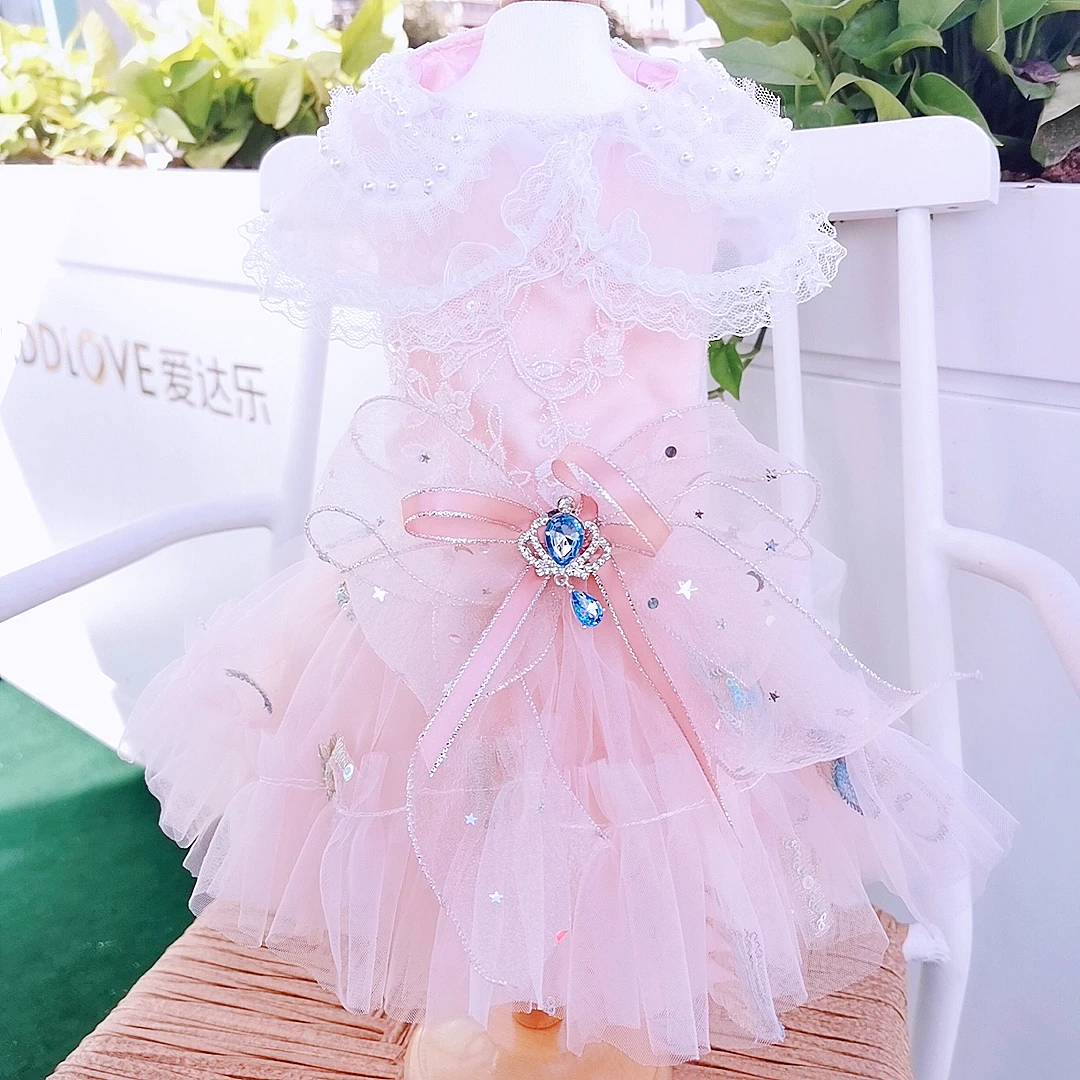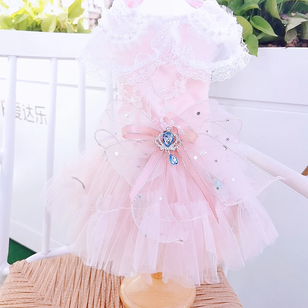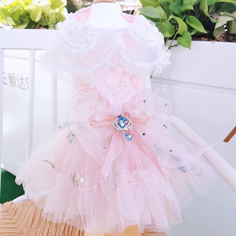Розовые платья принцессы для домашних собак; Модное платье ручной работы с жемчужинами и кружевным вырезом; Платье с вышивкой и бантом для маленьких средних собак; Одежда для щенков