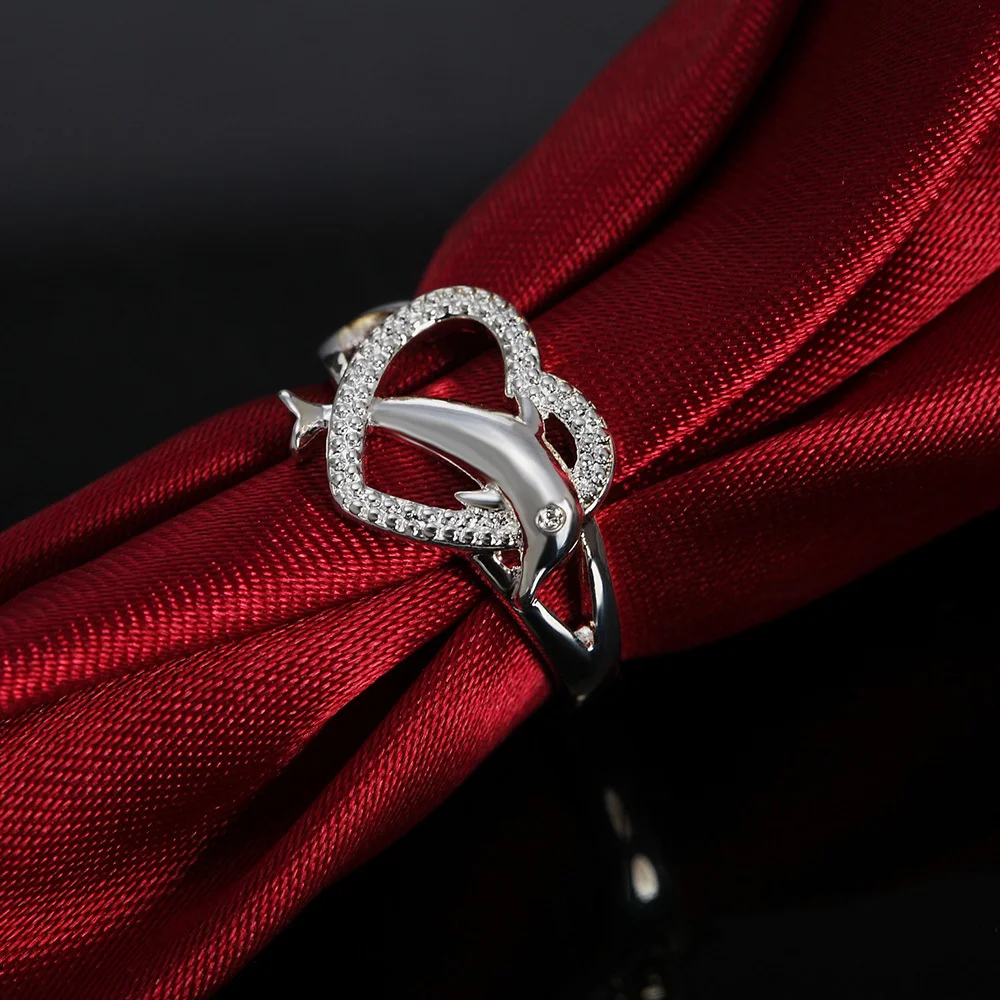 Женское кольцо с дельфином из серебра 925 пробы, в форме сердца