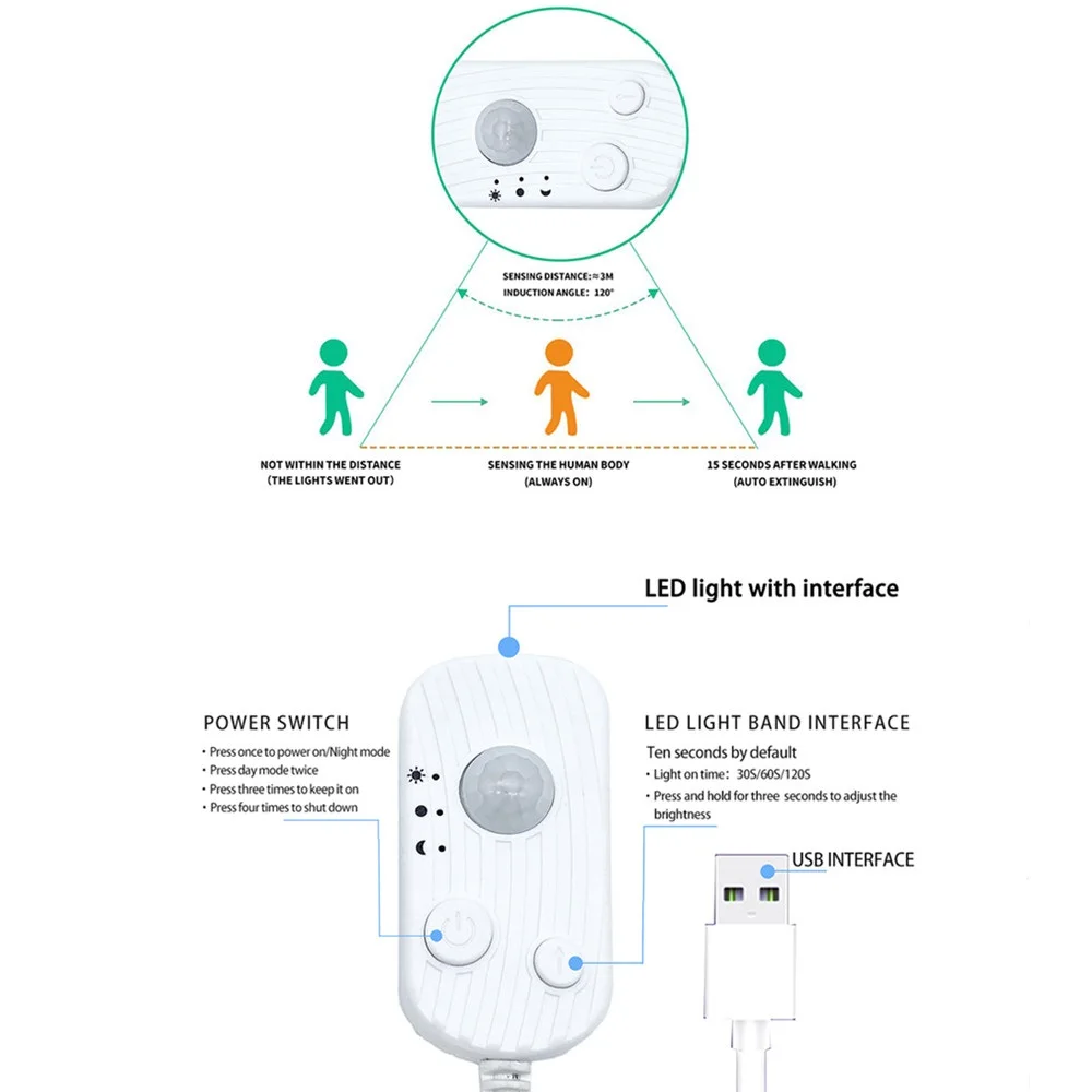 Светодиодная лента с монолитным блоком светодиодов и датчиком движения, гибкая приглушаемая лампа с USB и монолитным блоком светодиодов для спальни, кухни, 5 В, 320 светодиодов