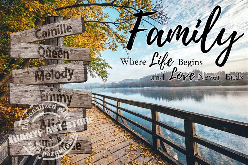 Персонализированный закат пляж семья, где жизнь, любовь никогда не заканчивается, вдохновляющие цитаты, холст, настенное искусство, знак имени, картина на заказ