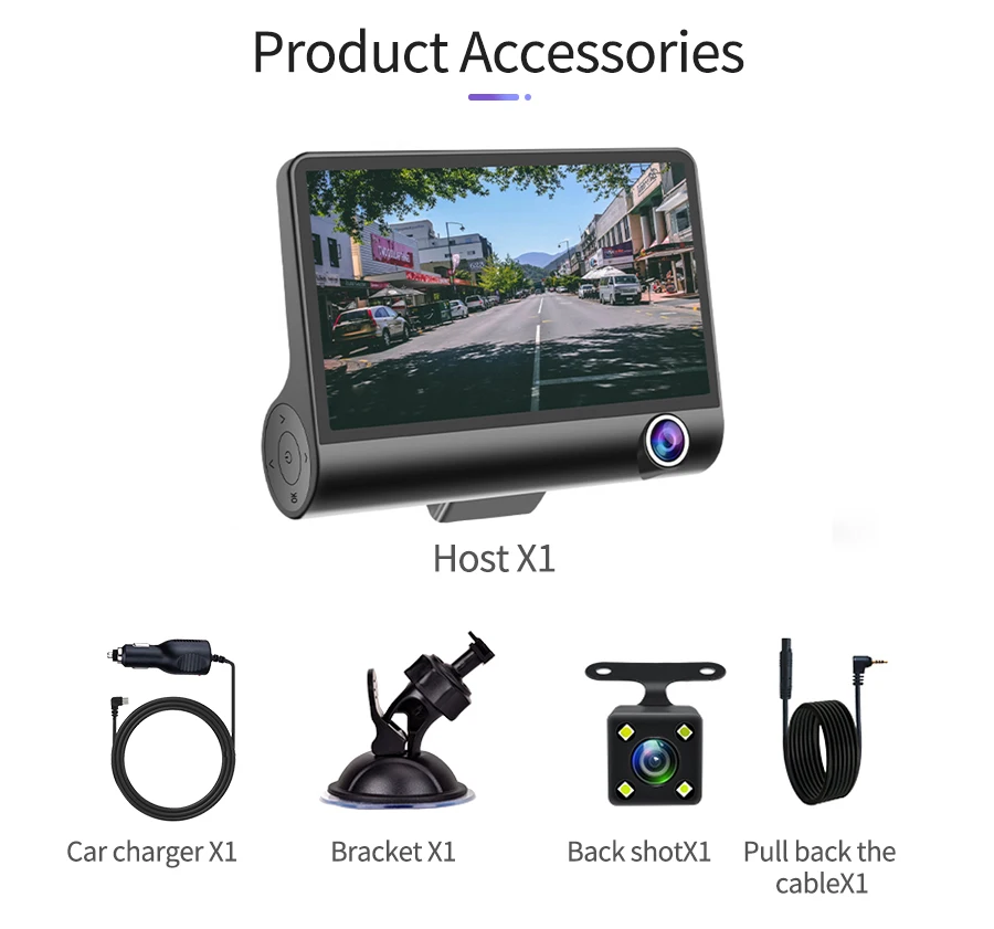 1 х Автомобильный видеорегистраторАвтомобильное зарядное устройство-1 шт.1 X Руководство пользователя1 X Монтажные кронштейны1 X Standrad Reaview камера (опционально)1 X кабель камеры Reaview (опционально)1 X понижающая линия (опционально)Кардридер-1 шт. (бесплатно)Наш продукт не оснащен картой памяти. Рекордер должен быть оснащен высокоскоростной C10 или более высокой картой памяти для нормального использования. Рекомендуется покупать упаковку карты памяти в этом магазине, чтобы избежать нежелательных реакций на продукт из-за покупки неправильных карт памяти!