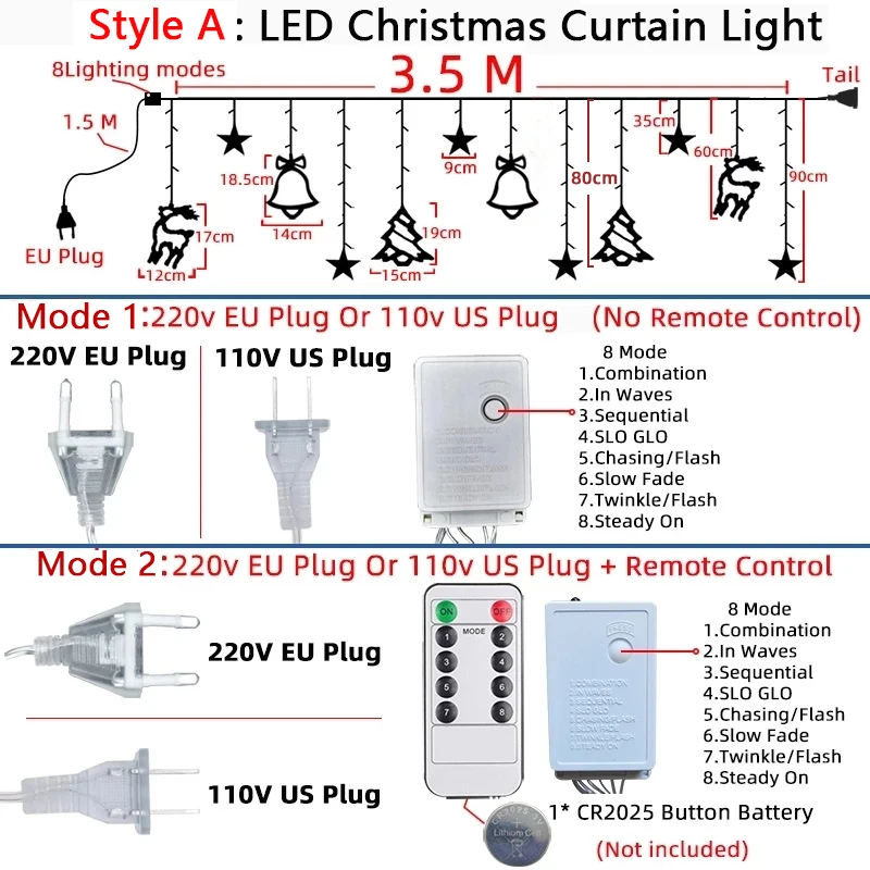 Стиль B:Светодиодный лунный занавес светильникХарактеристики:Цвет: теплый белый, разноцветныйВодонепроницаемость: IP44Материал: медная проволока + пластиковая крышкаКоличество подвесок: 3 луны, 3 больших звезды, 6 маленьких звездДлина: 3,5 мВысота: 0,35 М-0,9 мНапряжение: 220 В переменного тока/110 ВСтандарт штепсельной вилки: штепсельная вилка европейского стандарта/штепсельная вилка американского стандартаСвинцовый провод (линия): 1,5 м8 режимов • Питание: 1. Постоянный светильник режим 2. Режим вспышки 3. Мигающий режим 4. Непрерывный режим 5. Режим волны 6. Fantasy 7. Свое существование режим 8. Медленный режим вспышкиРежим 1:220 В штепсельная вилка европейского стандарта или 110 В штепсельная вилка американского стандарта (без пульта дистанционного управления)Режим 2:220 В ЕС штекер или 110 В, штепсельная вилка стандарта США + пульт дистанционного управления УправлениеМодель батареи дистанционного управления: 1 * CR2025 кнопочный аккумулятор(Не входит в комплект)