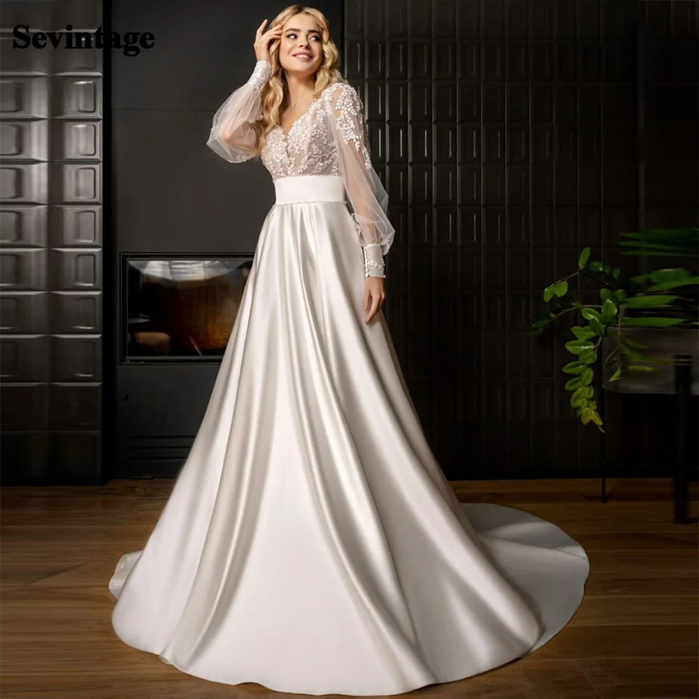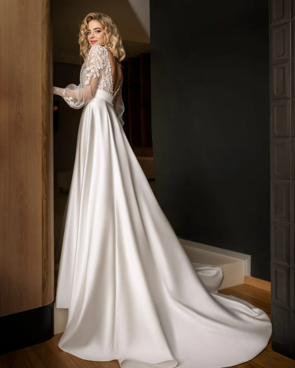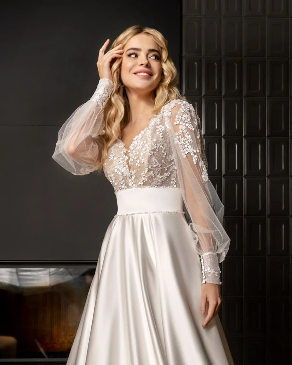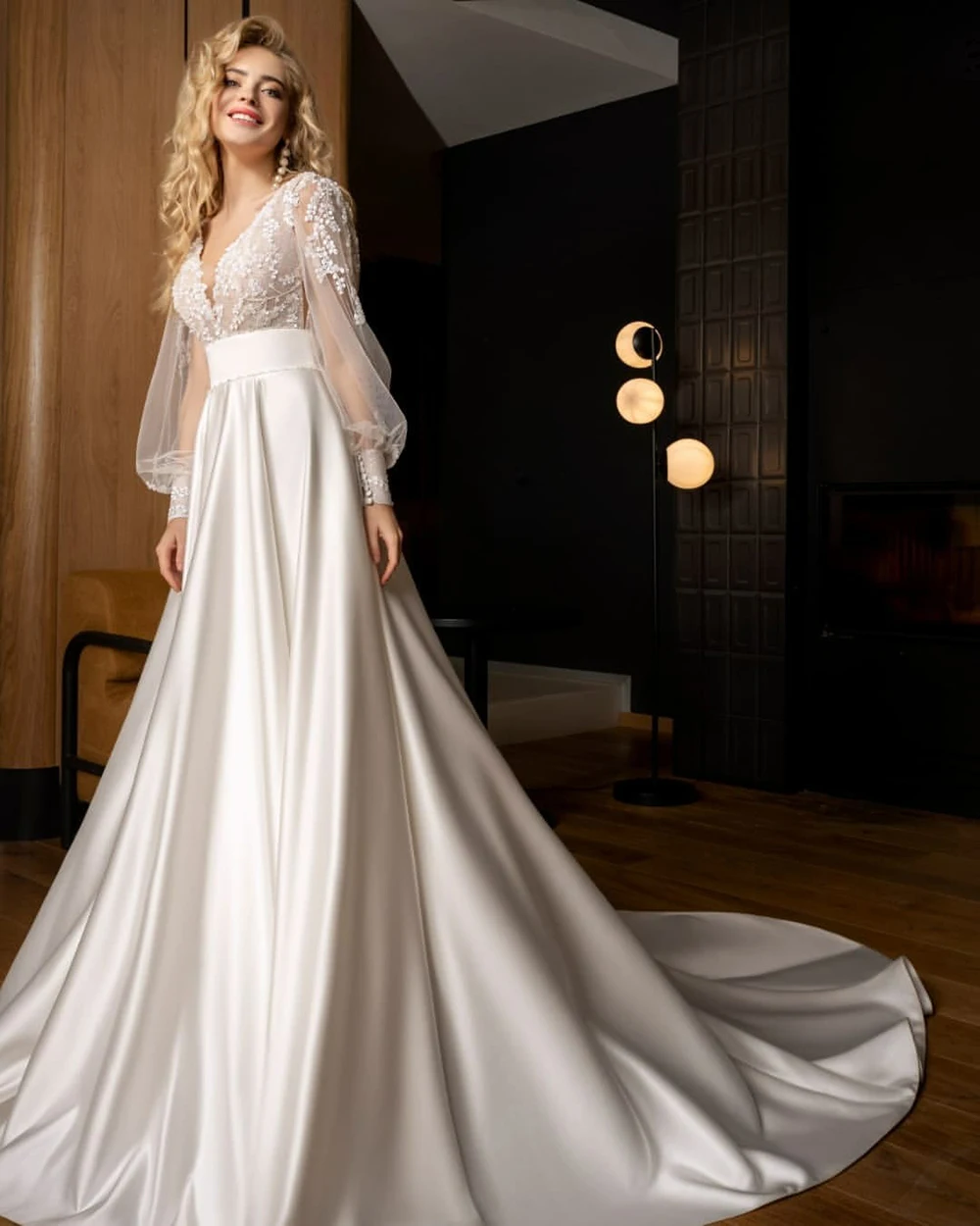Платье свадебное кружевное с длинным рукавом и V-образным вырезом