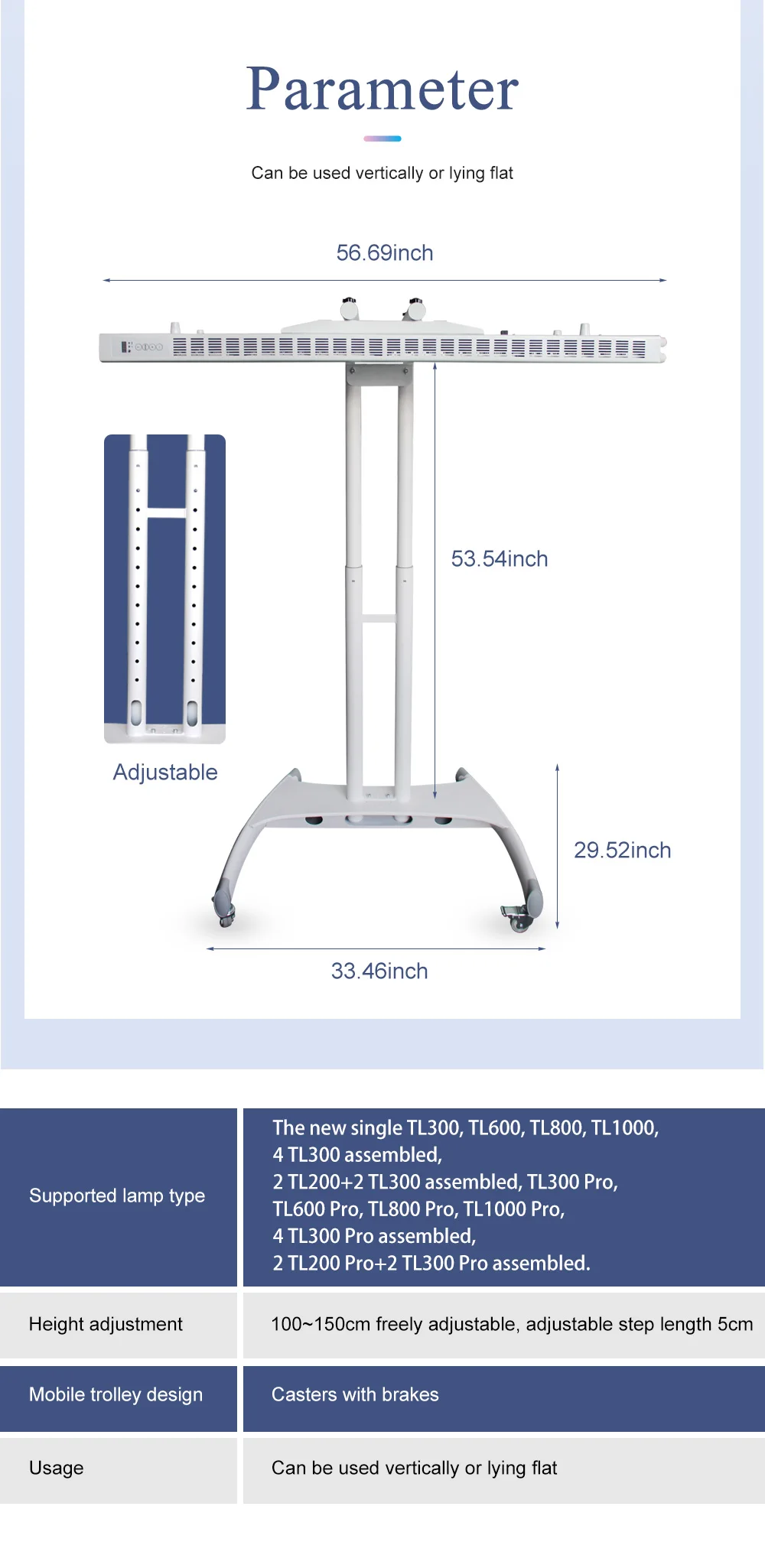 TL300/TL600/TL800 с подставкой, умеренная цена, можно повесить отдельно или использовать Горизонтально с кронштейном, область облучения подходит для всей физиотерапии тела, будь то лежа или стоящая физиотерапия, это может принести вам хороший эффект физиотерапии.