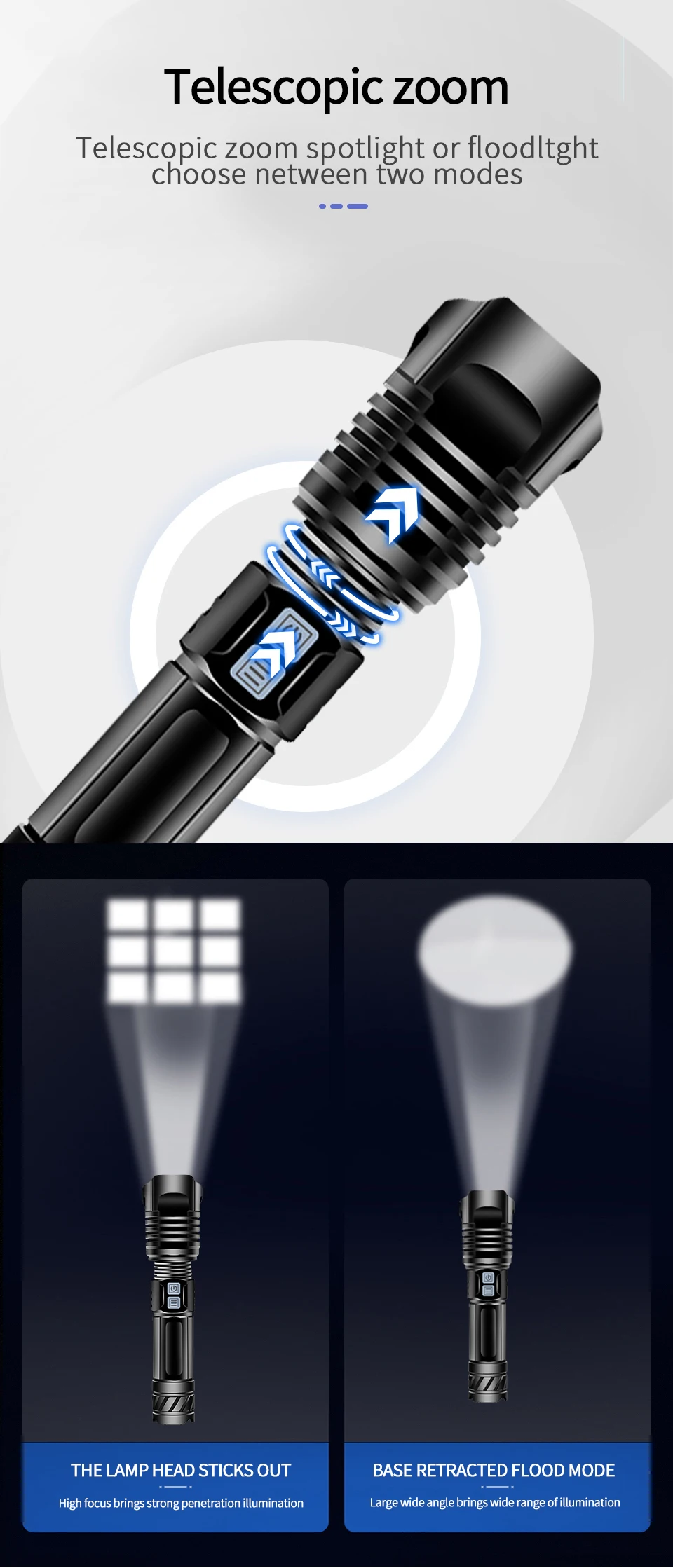 Информация о продукте:Бренд: PavinoФитиль: XHP170Батарея: 18650 или 26650 (не входит в комплект)Срок службы лампы: 100000 часовВремя освещения: 3-4 часа для батарей 18650, 5-8 часов для батарей 26650.Режим переключения: 5 передач, кнопка питания: низкий светильник-средний Светильник-сильный светильник. Функциональная клавиша: один щелчок Супер яркий-двойной щелчок мигает.Метод фокусировки: телескопическая фокусировка, диапазон дальнего и ближнего облучения может быть выбран по желанию.Водонепроницаемость: IPX5, он может работать нормально даже в дождливые дни. Будьте осторожны, чтобы не замачивать в воде.Метод зарядки: Прямая зарядка через USB, поддержка ввода и вывода и возможность зарядки мобильных телефонов.Применимые варианты: Ежедневный, кемпинг, поиск и спасение, патруль, альпинизм, туризм, рыбалка и т. д.