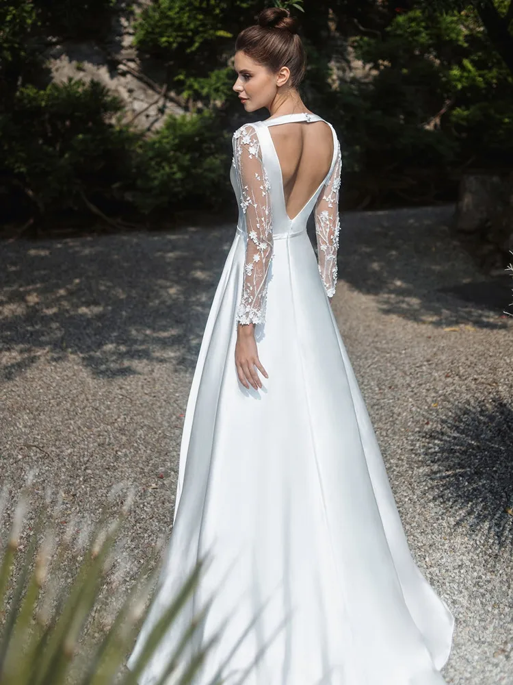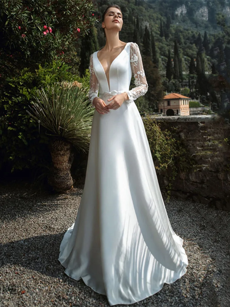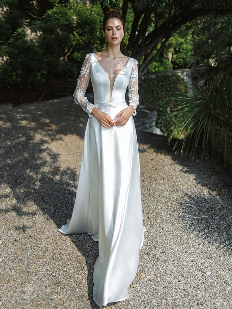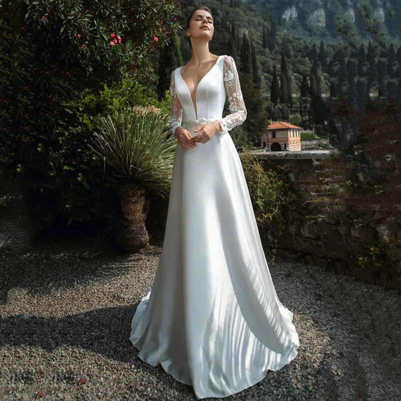 Женское атласное свадебное платье, элегантное белое платье А-силуэта с длинным рукавом, глубоким V-образным вырезом и открытой спиной, индивидуальный пошив, 2021