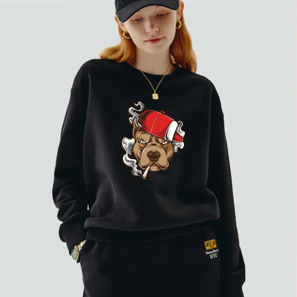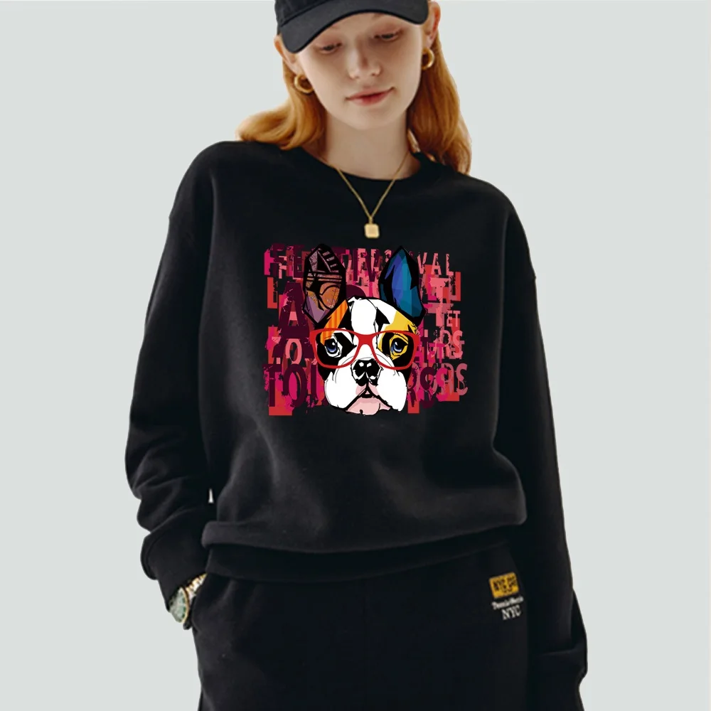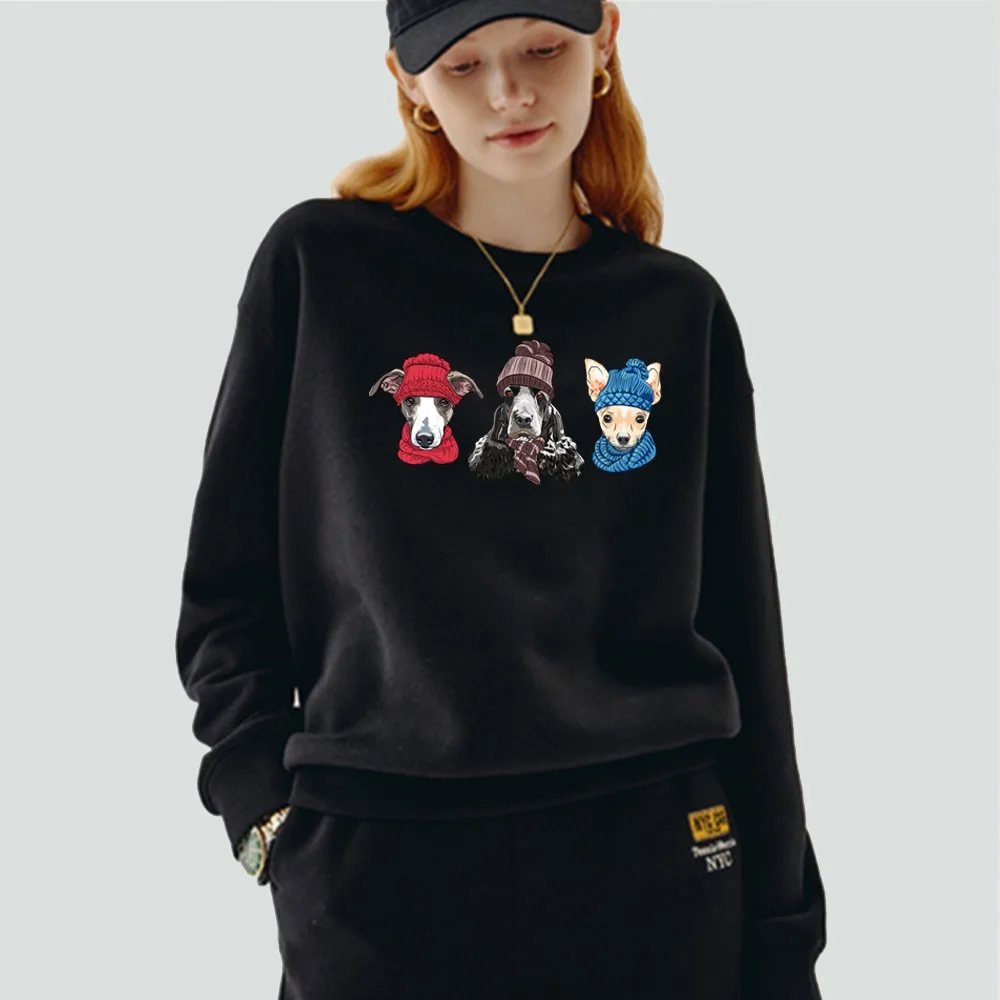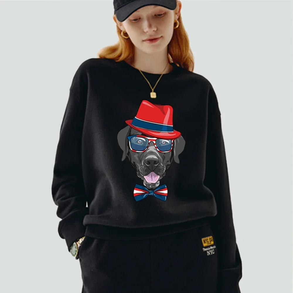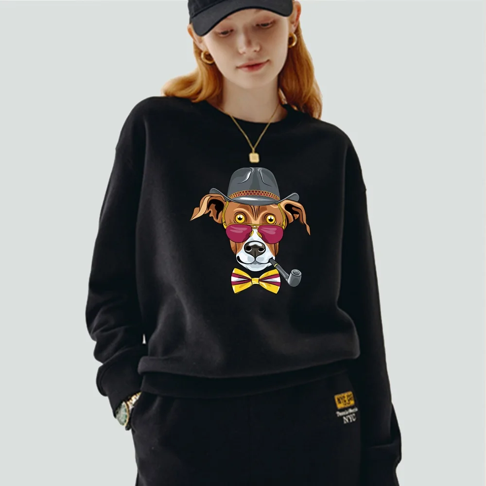 Женский пуловер, теплый свитшот с длинным рукавом и круглым вырезом, с мультяшным принтом собаки, Повседневная осенне-зимняя черная одежда из полиэстера, Топ