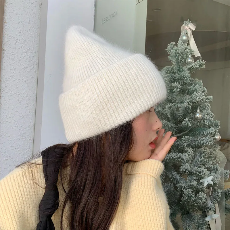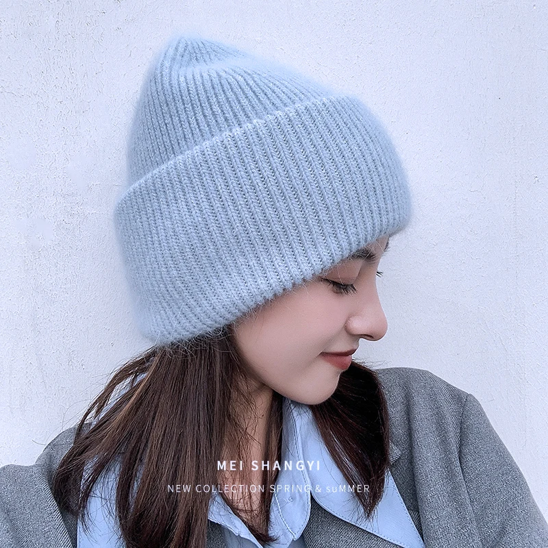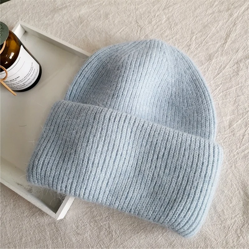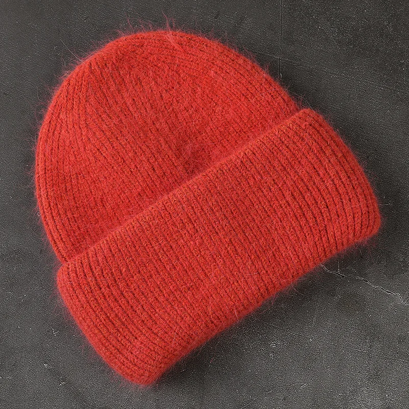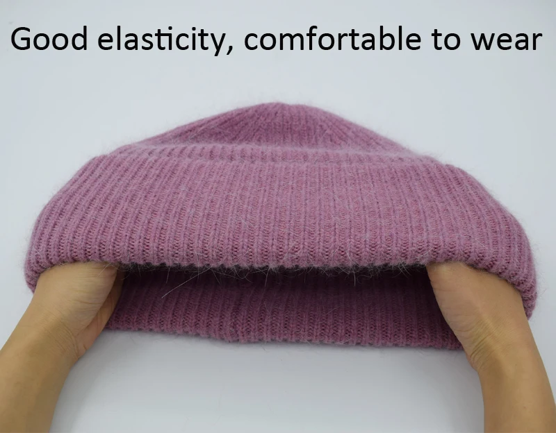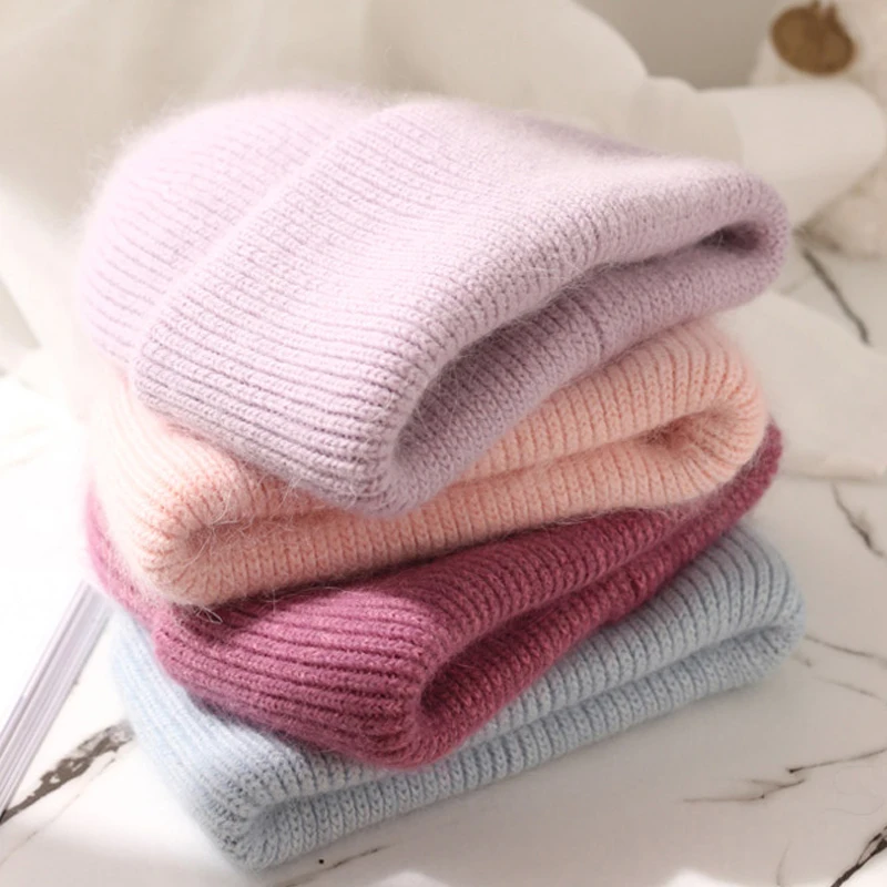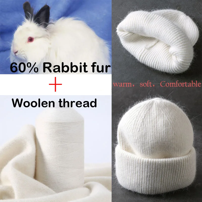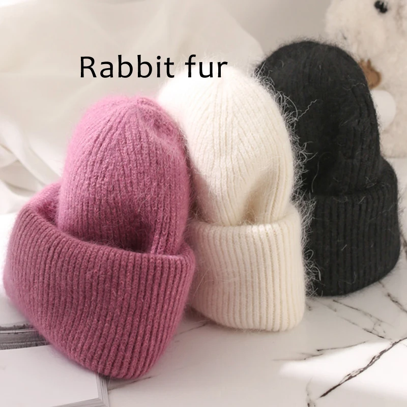 Зимние вязаные облегающие шапки из натурального кроличьего меха для женщин, модные однотонные теплые кашемировые шерстяные шапочки, облегающие шапки, женские толстые шапки с тремя складками