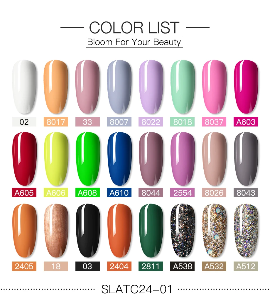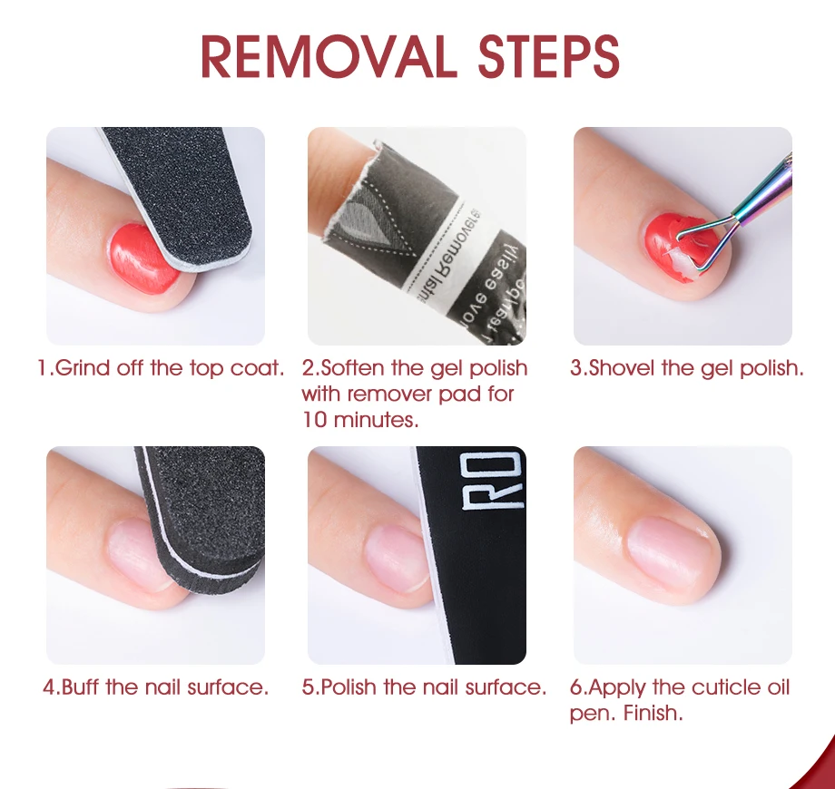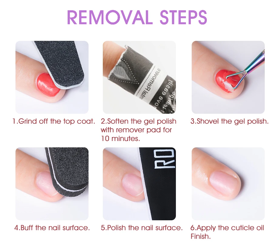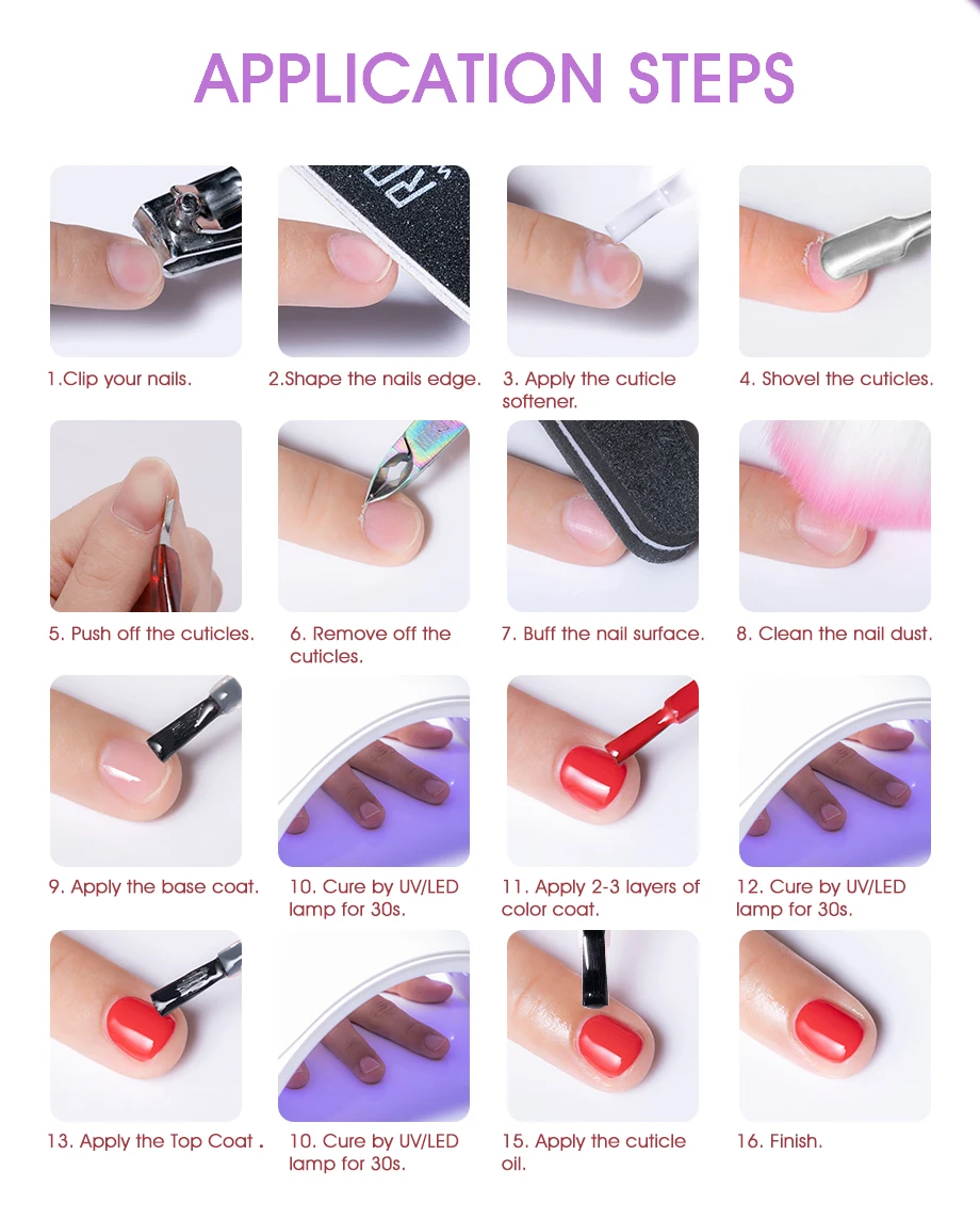 Шаг за шагом:-1. Форма ногтя. Слегка смочите поверхность ногтевой пластины. Дезинфицировать.-2. Нанесите базовый слой основы от кутикулы до свободного края (не забудьте запечатать край ногтя). Высушите ногти под светодиодный светильник в течение 10 секунд или УФ-светильник в течение 2 минут.-3. Нанесите тонкое пальто отмачиваемого геля на выбор. Свободный край крышки. Лечение: 30 секунд в светодиодный светильник, или 2 минуты в УФ-лампе.-4. Повторите 2-е тонкое покрытие отмачиваемого гель-лака на ногти. Высушите под светодиодный лампой в течение 30 секунд или УФ-светильник в течение 2 минут.-5. Нанесите верхнее пальто. Свободный край крышки. Лечение: 30 секунд в светодиодный светильник.-6. Удалите липкий остаток на ногтях с помощью очищающего средства. Затем нанесите питающее масло кутикулы для увлажнения влаги в кутикулу и кожу вокруг ногтя.Для удаления:-1. Отмачивайте ногти в акриловом удалителе в течение 5 минут.-2. Аккуратно Наденьте на каждый ноготь всю эмаль для ногтей.Внимание:1. Объем-7 мл. Поскольку емкость бутылки составляет более 7 мл, гель для ногтей не будет полностью заполнен бутылкой!2. Плотно закрываются. Держите подальше от солнечного света. Хранить в недоступном для детей месте.