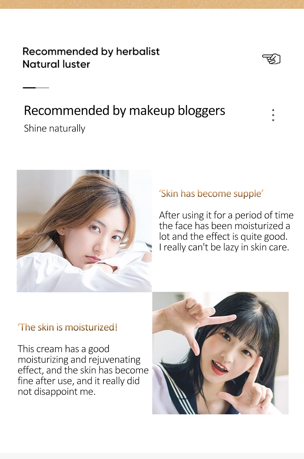 Блестит естественным образом"Кожа стала дополнительной"После использования в течение определенного периода времени, лицо было увлажнено много и эффект довольно хороший. Я действительно не могу быть ленивым в уходе за кожей.Кожа увлажнена!Этот крем имеет хороший увлажняющий и омолаживающий эффект, и кожа стала тонкой после использования, и он действительно не разочаровал меня.