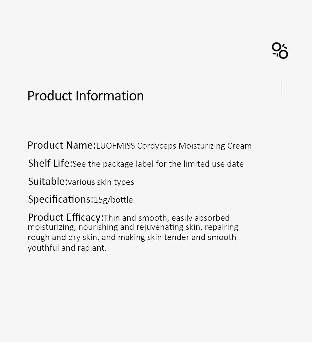 Название продукта: увлажняющий крем LUOFMISS CordycepsЭффективность продукта: тонкая и гладкая, легко впитывается, увлажняет, питает и омолаживает кожу, восстанавливает грубую и сухую кожу, делает кожу нежной и гладкой, молодой и сияющей.Увлажняющий тендеризаторРемонт грубой и сухой кожиОсветляет тон кожиУвлажняющийГладкий и растягивающийся