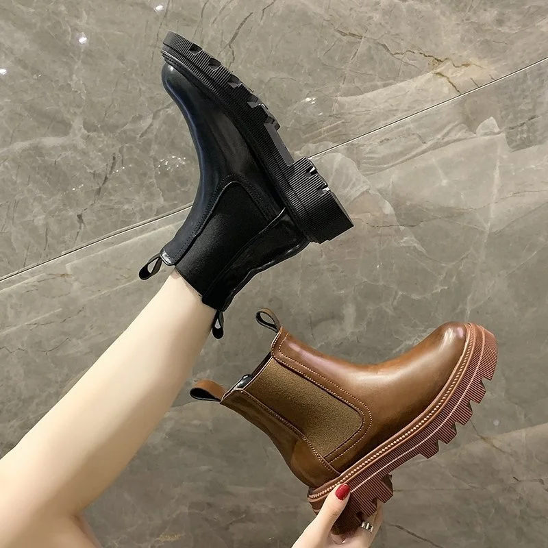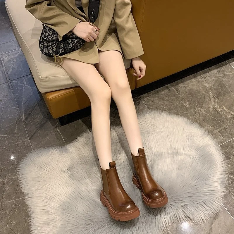 Женские ботинки челси на платформе, коричневые, черные, бежевые или белые короткие ботильоны на меху, готическая обувь в стиле панк, Осень-зима 2021
