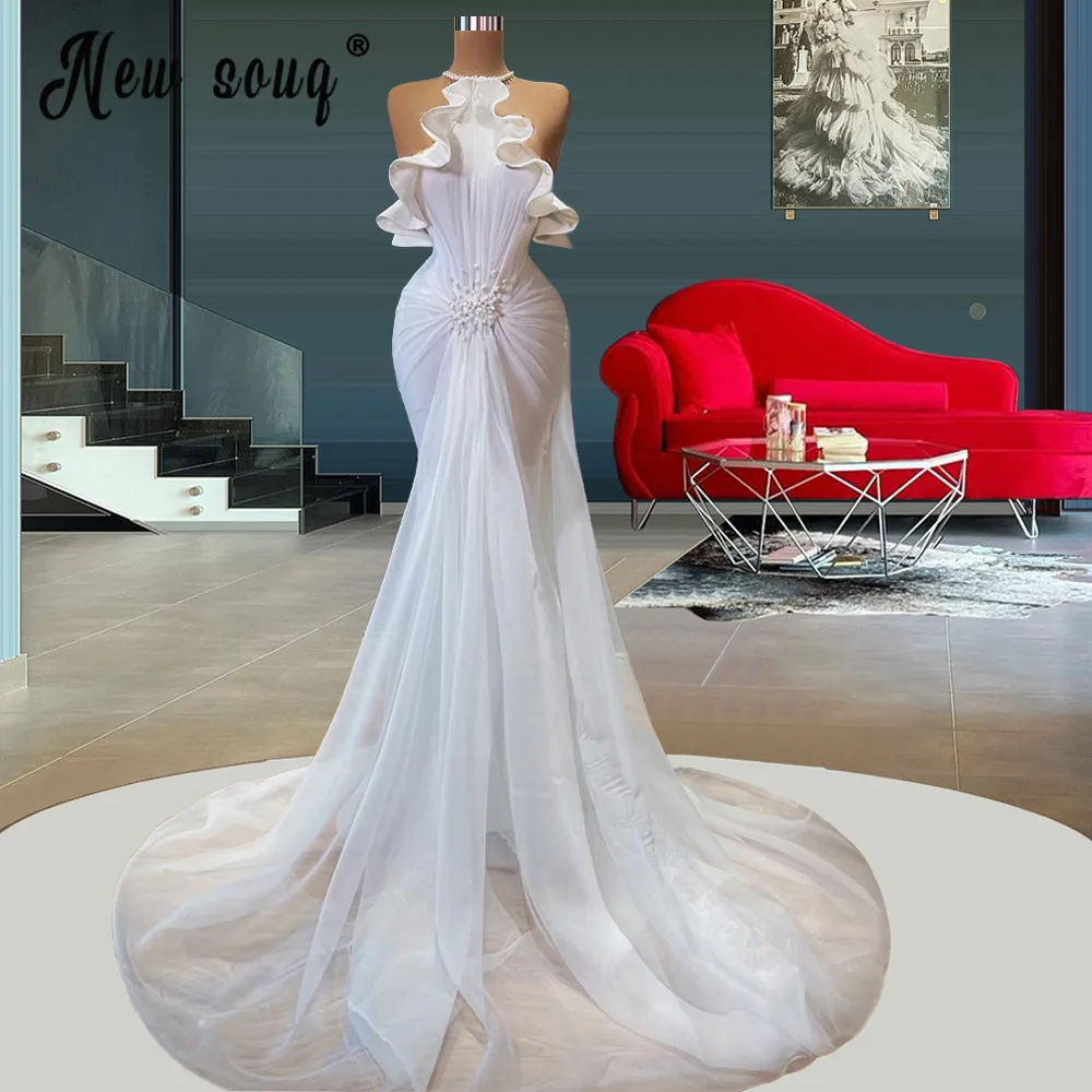 Halter Chiffon Summer Backless Evening Gowns Pearls Pleated Mermaid White Prom Gowns Ruffles Elegant Formal Gown Bride Long Robes