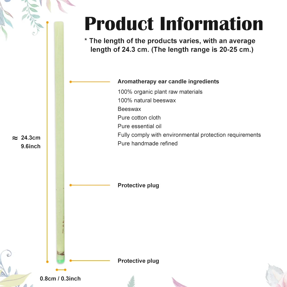 1) подготовьте свою площадь, чтобы убедиться, что комната не имеет воды, температура должна быть окружающей среды и освещение мягкое. В фоновом режиме вы можете наслаждаться нежной музыкой. 2) подготовьте свое оборудование, разложите ушные свечи, маленькую чашу с водой, зеркало, зажигалку или спички и пару ножниц. 3) лежите в удобном положении на диване или даже на полу! Положите голову на подушку и наклоните голову на одну сторону. Это хорошая идея, чтобы иметь кого-то рядом, чтобы помочь вам, особенно если это ваш первый опыт закручивания уха. После того, как вы установили обычное свечение уха на регулярной основе, убедитесь, что у вас есть зеркало, чтобы вы могли оценить свой прогресс во время свечения. 4) аккуратно поместите свечу во внешнее отверстие уха, а Ушная свеча снабжена небольшим комфортным наушником, который мягко помещается во внешнее отверстие уха, чтобы убедиться, что у вас есть хорошее уплотнение между отверстием уха и концом свечи. 5) светильник свеча, как только загорится, Свеча создает вакуумный эффект s светильник, окисляет, парит и вытягивает размягченный воск и мусор из ушек. Это очень мягкий и неинвазивный процесс, и вы, вероятно, почувствуете чудесный Потрескивающий или мягкий шипящий звук во время процедуры. Приблизительное время горения свечи составляет 10-12 минут. 6) Снимите свечу с уха, как только пламя достигнет линии маркировки, потушите свечу в стакане воды и отрежьте сгоревшую часть. Примечания: благодаря светильник и экрана Цвет Товара может быть s светильник ly отличается из-за характеристик монитора компьютера. Возможны незначительные отклонения в размерах из-за различных измерений вручную.