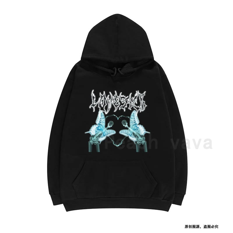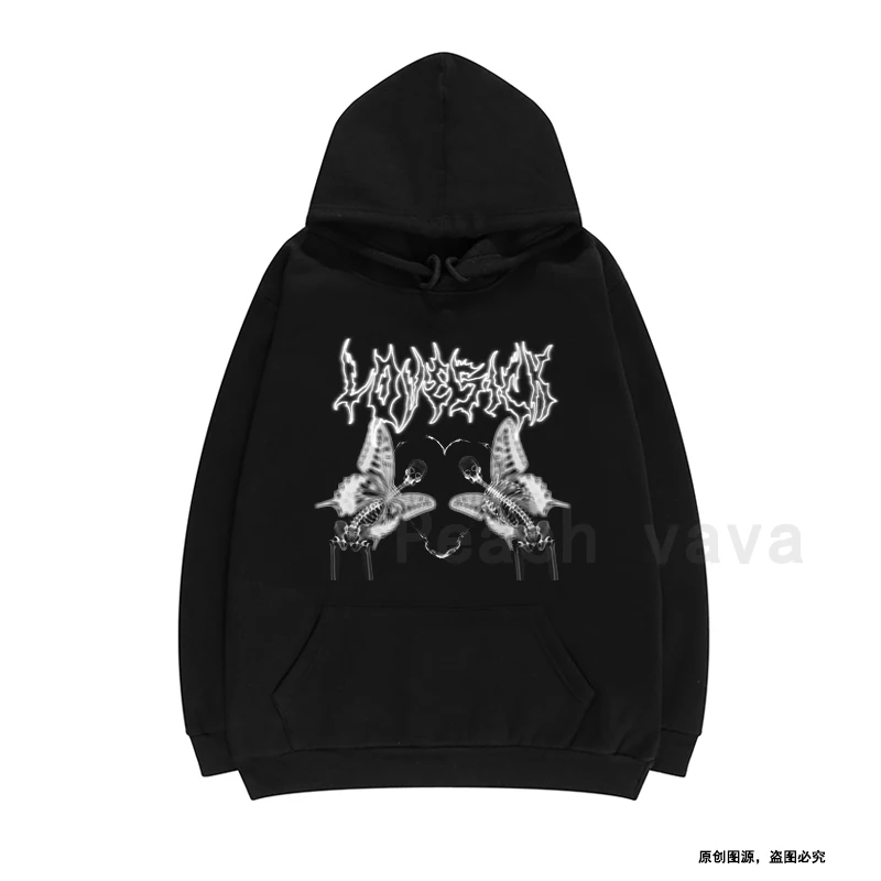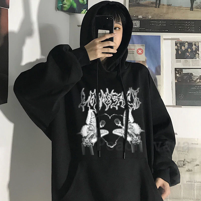 Художественный Черный Пуловер С Рисунком бабочки скелета сердца, Женская Повседневная Свободная Толстовка с капюшоном в стиле панк, уличная одежда