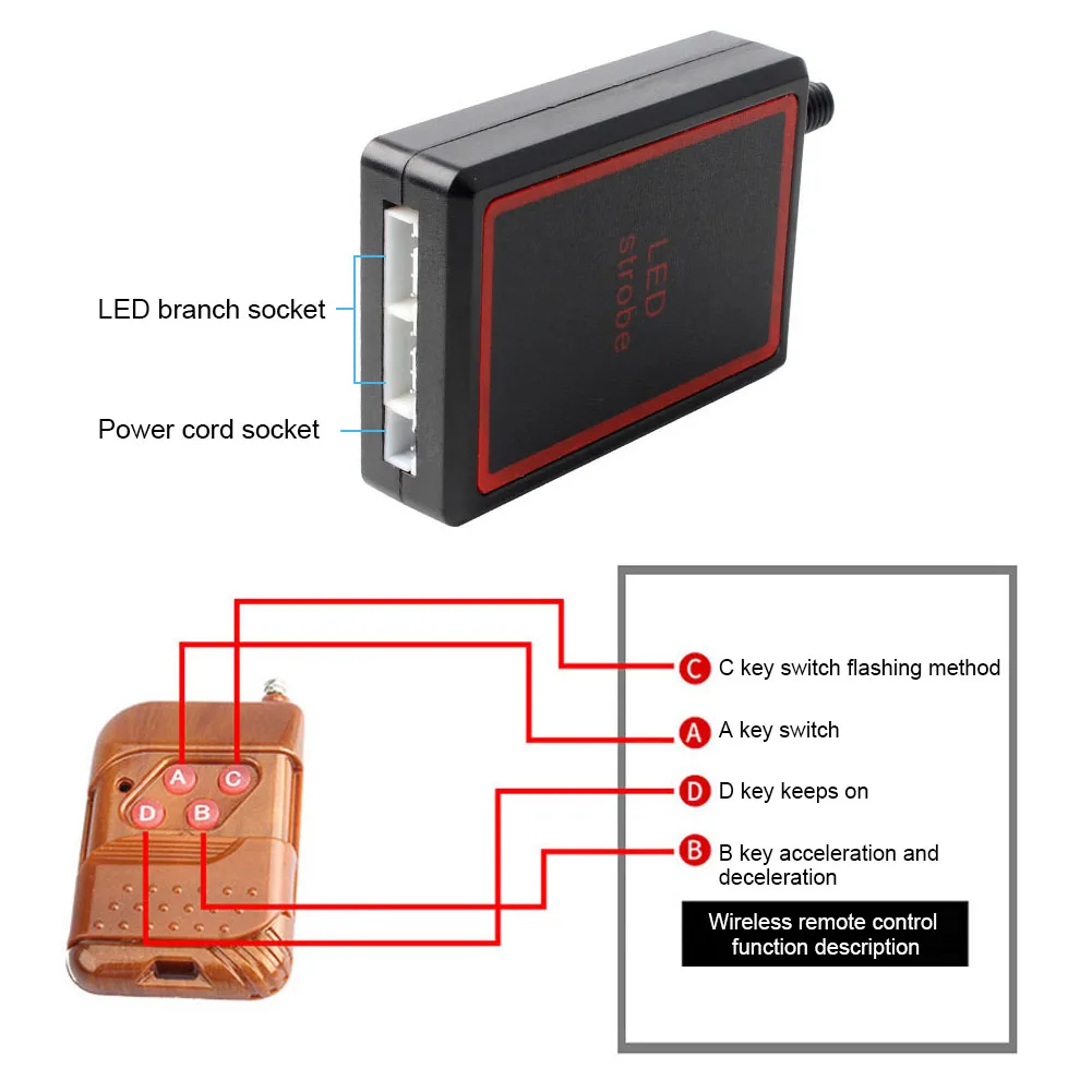 * 1. Стробоскопический светильник дистанционного управления-с пультом дистанционного управления, вы можете легко включить/выключить и переключить светильник режим ing, легко подключить красный провод к положительному полюсу и черный провод к отрицательному полюсу.