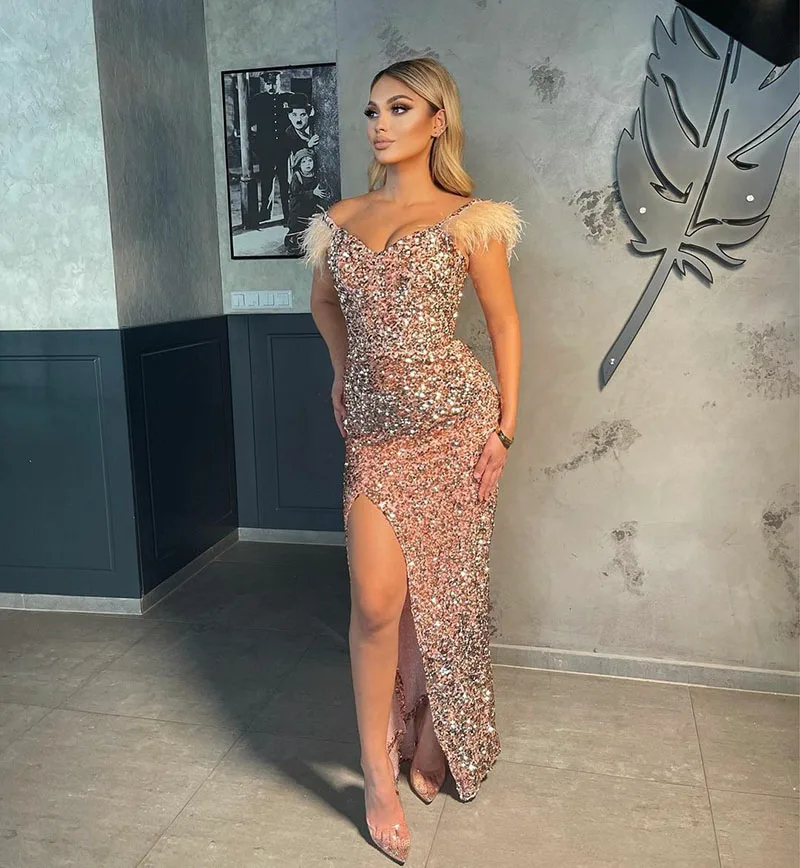 Женское вечернее платье с блестками soworthy, розовое золотистое платье с открытыми плечами и Боковым Разрезом, платье до пола для выпускного вечера,