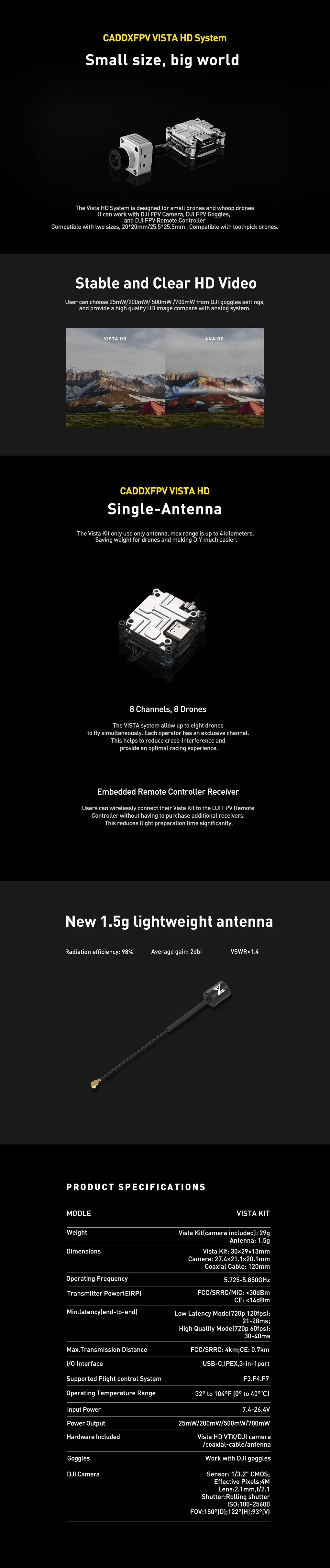 Caddx работает с DJI, чтобы выпустить новое поколение цифровых HD FPV передатчиков. Vista была полностью авторизована DJI и совместима с их системой HD FPV. Еще лучше, Caddx Vista был разработан, чтобы быть легче и меньше, чем модуль DJI Air Unit, а также поставляется с монтажными отверстиями для более легкой установки на ваш quad!