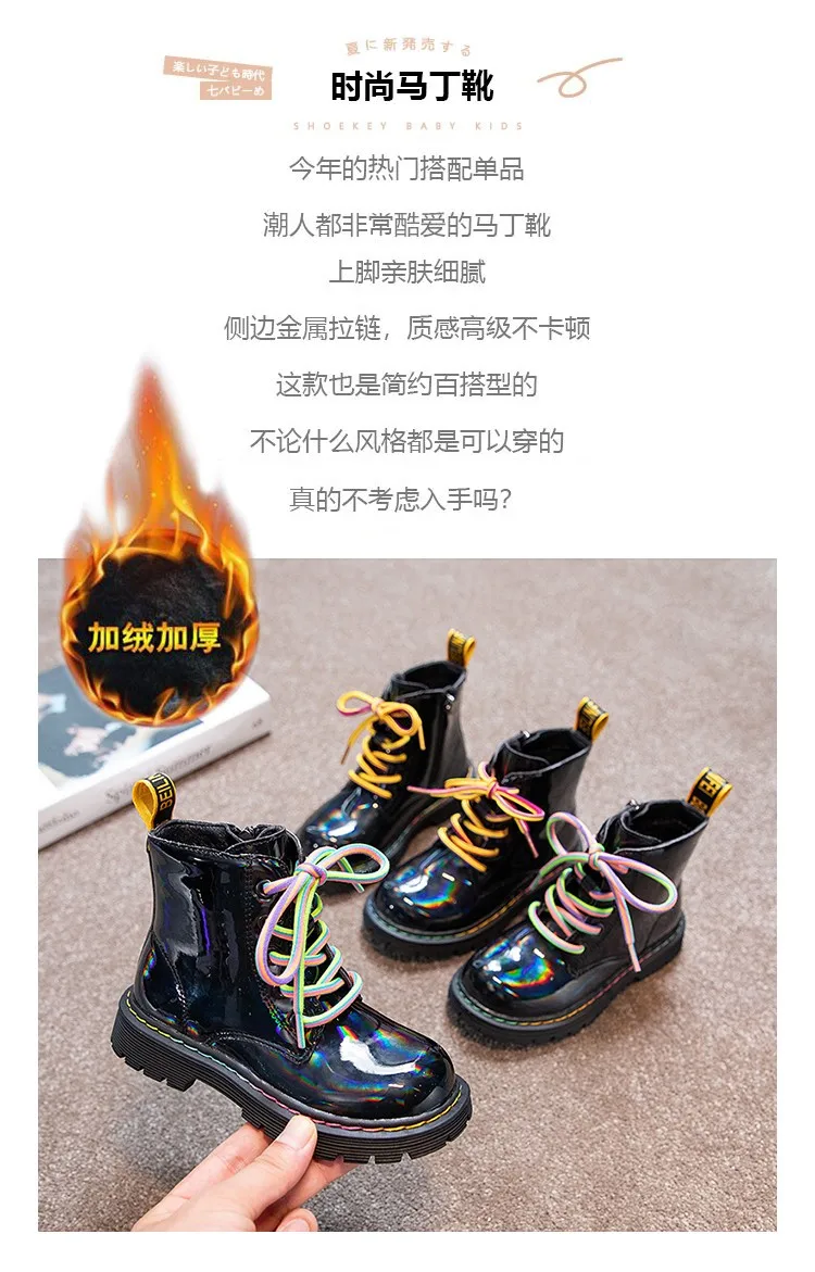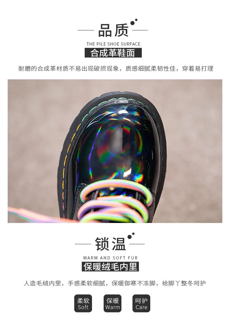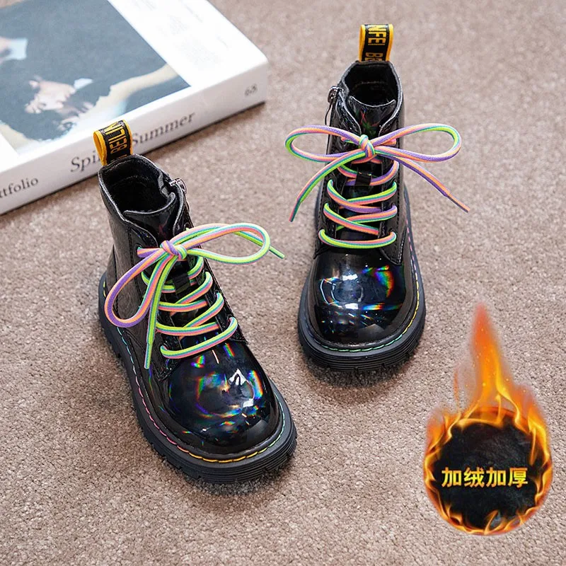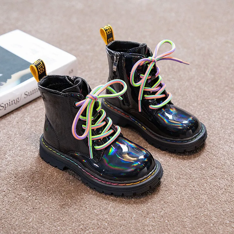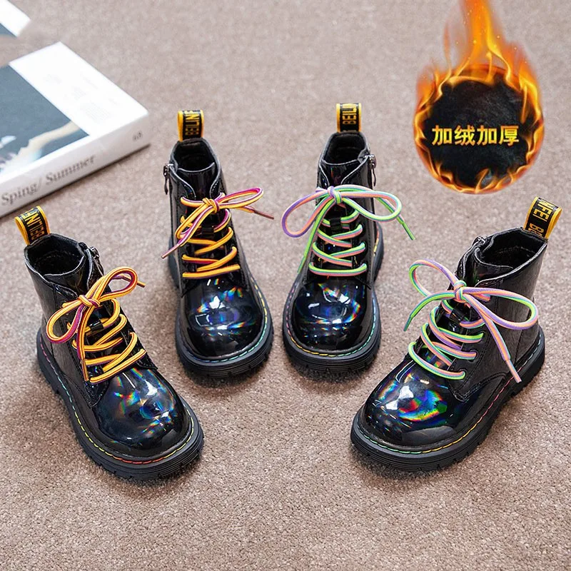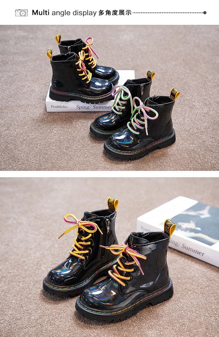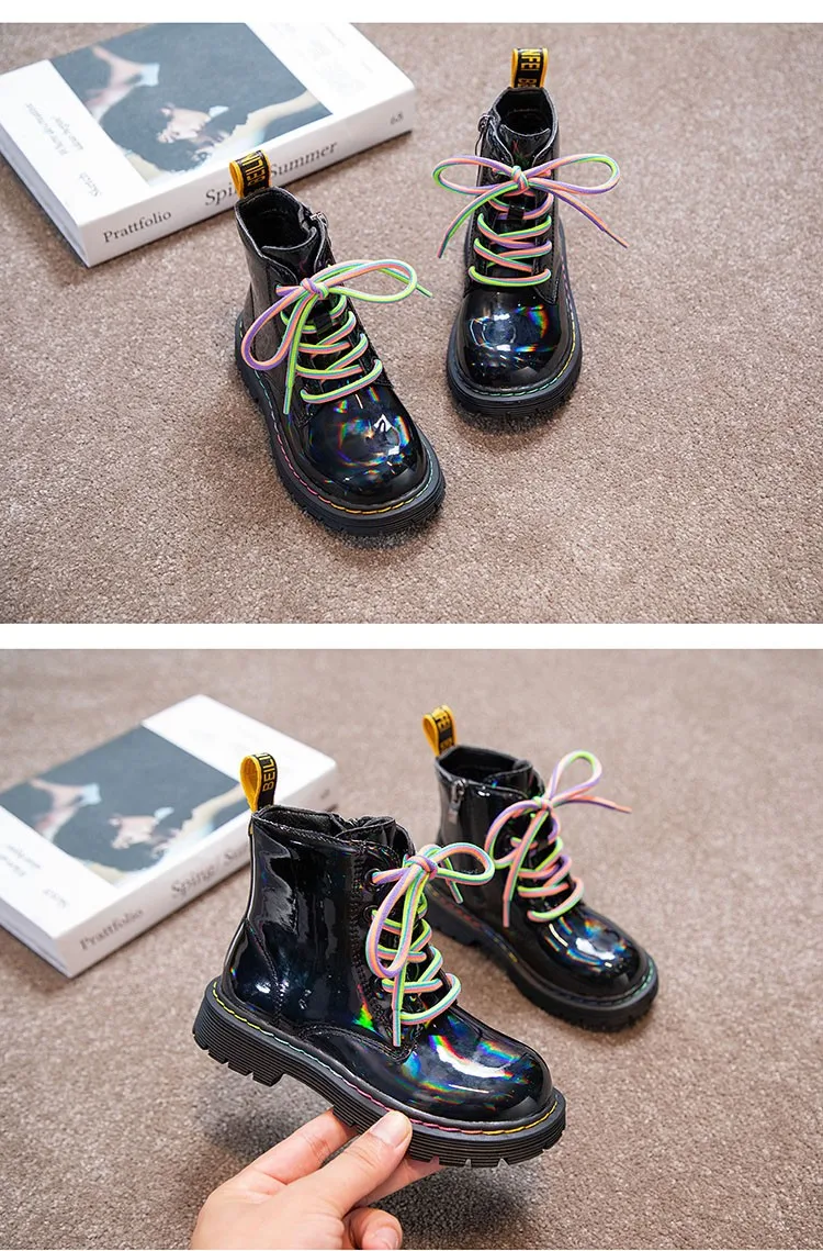 Детские зимние ботинки Martin черного цвета лазерного цвета Радужная лакированная кожа для мальчиков и девочек короткие ботинки красивая модная детская обувь 26-36