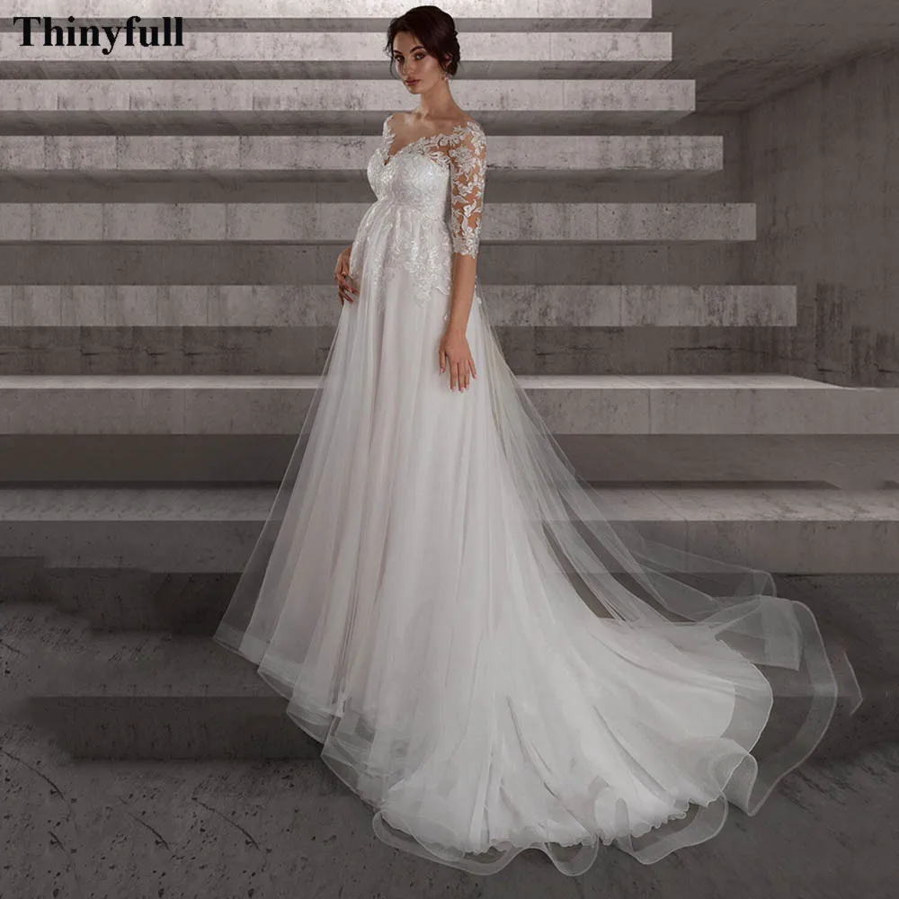 Кружевные свадебные платья Thinyfull в стиле ампир для беременных женщин полурукава прозрачный Круглый вырез мягкое Тюлевое платье для беременных невесты