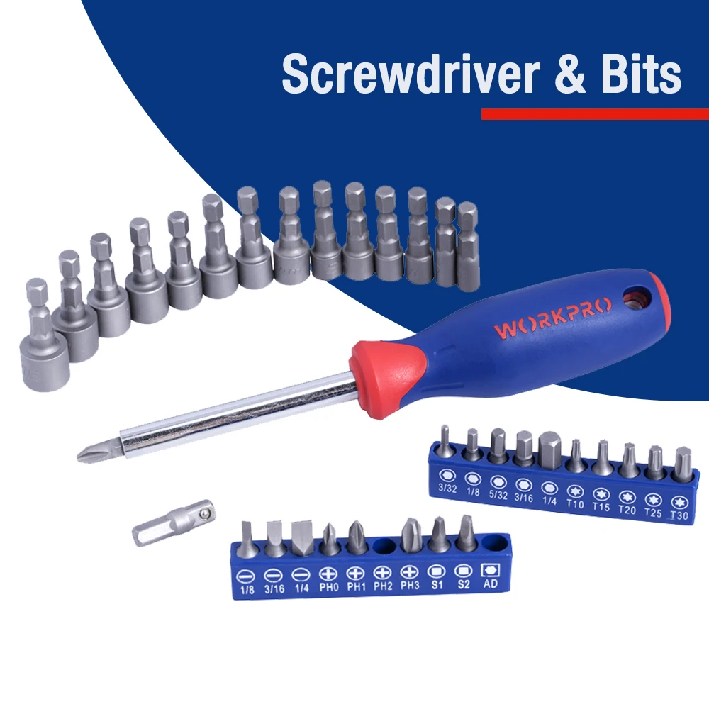 Этот WORKPRO набор инструментов механика идеально подходит для дома, в гараже, на рабочем месте. Предназначен для того, чтобы удовлетворить все основные потребности от сборке нового гриль, велосипед, мебель, или работающих на транспортном средстве. Этот набор торцевых головок включает в себя в общей сложности 94 розетки в три размеры привода-1/4, 3/8 и 1/2-дюймовым экраном.