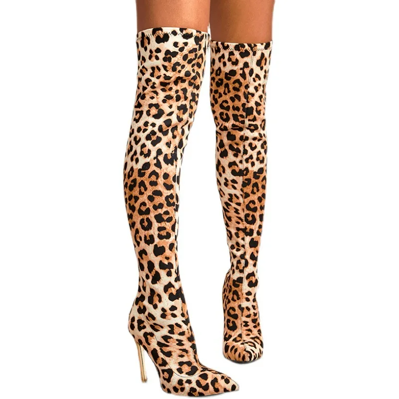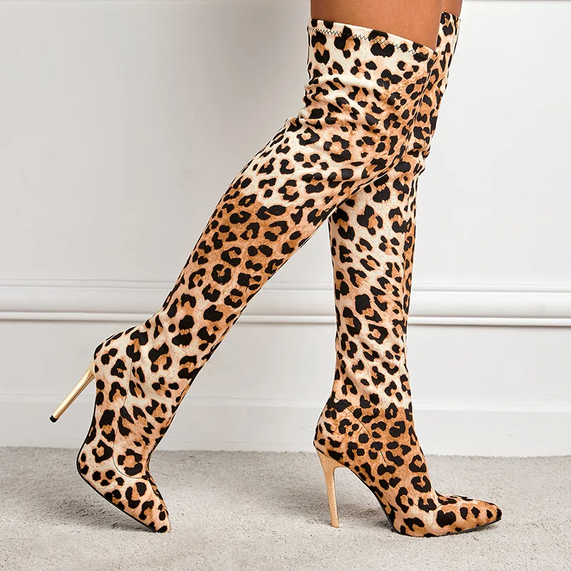 Женские высокие сапоги выше колена, привлекательные леопардовые сап...