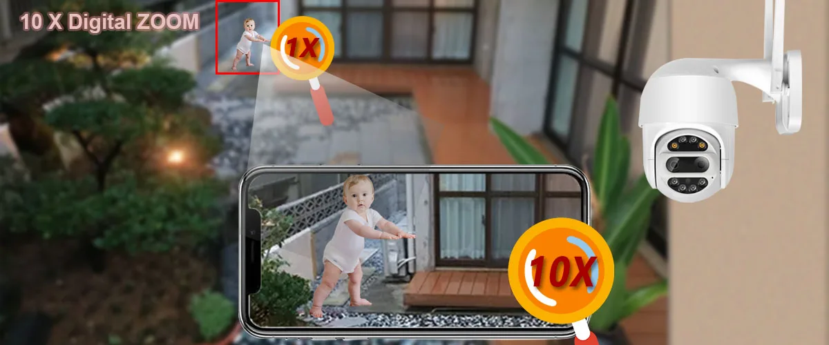 Камера собран в3,6 мм и 16 мм объектив с двумя объективами, Легко переключать 1.0X на 10.0X зум мгновенно в приложении.