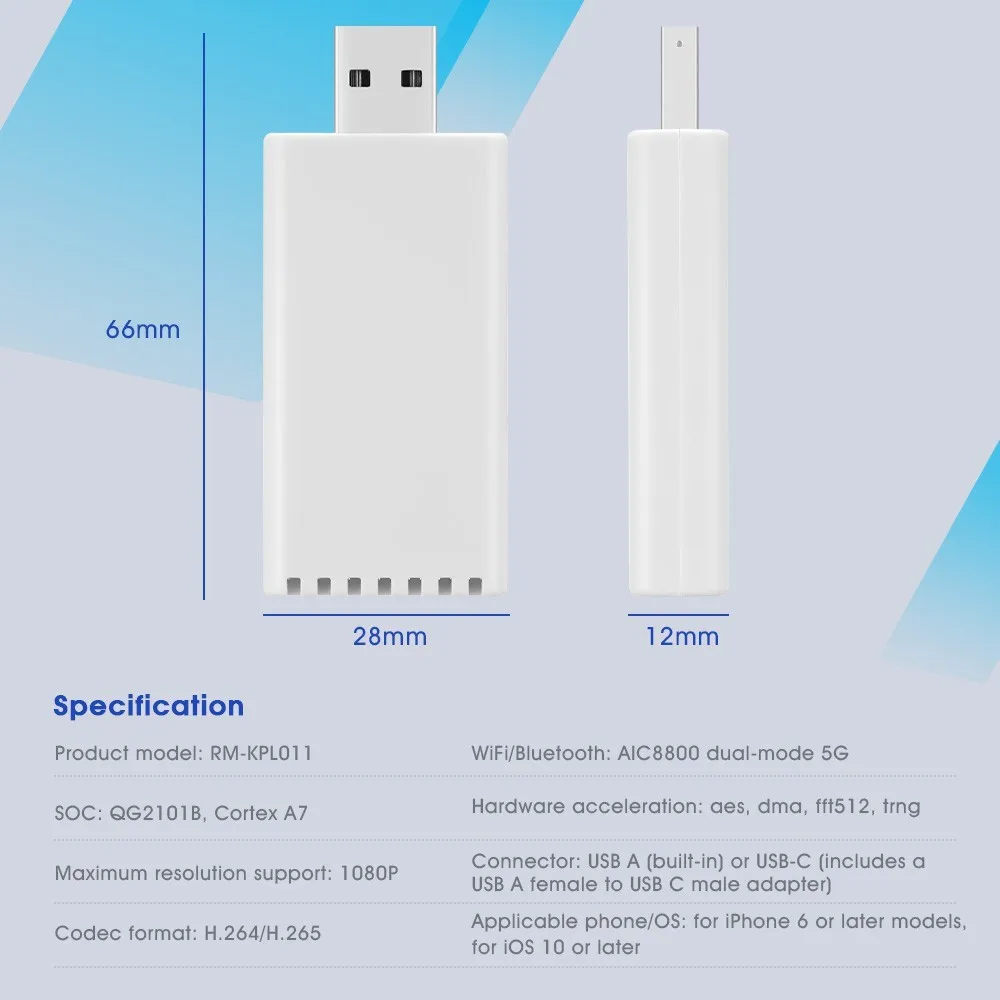 Преобразуйте оригинальную проводную функцию автомобильного проигрывания автомобильного радио в беспроводную автомобильную игру, она позволяет подключать ваш телефон к автомобилю беспроводным способом.Беспроводная передача обеспечивает более удобное подключение, что значительно улучшает опыт использования автомобиля.Характеристика:1. Подключи и работай.2. Беспроводная скорость в настоящее время самая быстрая на рынке.3. Пропускная способность AP охватывает требования в различных регионах мира.4. Обновление OTA, расширение библиотеки адаптации.Спецификация:Модель изделия: RM-KPL011SOC: QG2101B, Cortex A7Максимальная поддержка разрешения: 1080PФормат кодека: H.264/H.265WiFi/Bluetooth: AIC8800 двухрежимный 5GАппаратное ускорение: aes, dma, fft512, trngРазъем: USB A (встроенный) или USB-C (в комплекте USB a female-USB C male adapter)Применимый телефон/ОС: для iPhone 6 или более поздних моделей, для iOS 10 или более поздних версийВходная мощность: 5 В, 1 ~ 2,1 АМощность Потребляемая мощность: 0,15 WМетод обновления: OTAАдрес управления: 192.168.2.1Размер упаковки: 10*10*4 смПосылка Вес: 0,15 кгПримечание:1. Поддерживает только Оригинальное воспроизведение автомобиля.