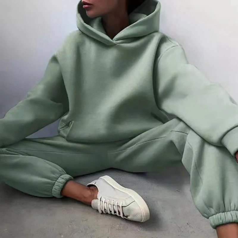 Костюм спортивный женский однотонный из двух предметов, толстовка с капюшоном и длинные штаны, повседневный теплый флисовый костюм с длинным рукавом, осень