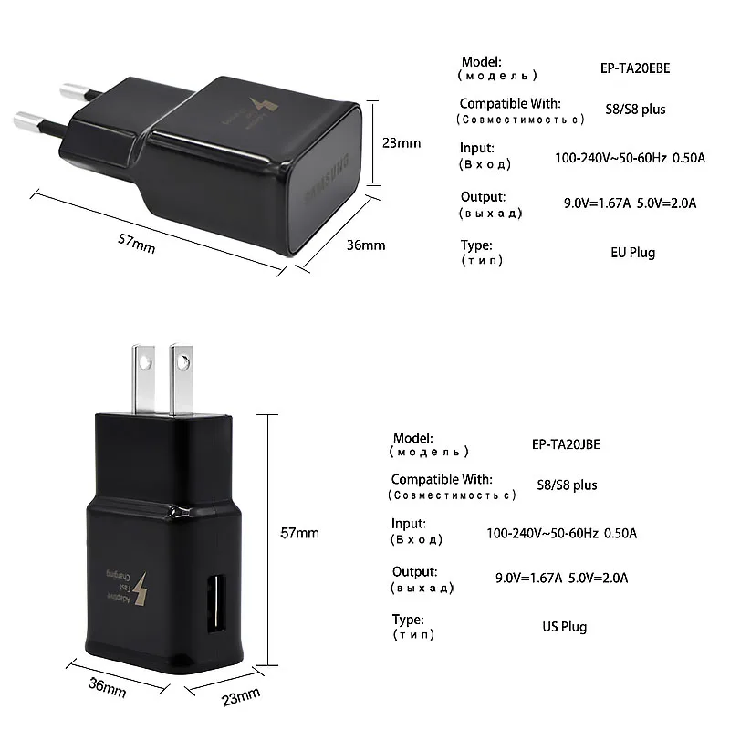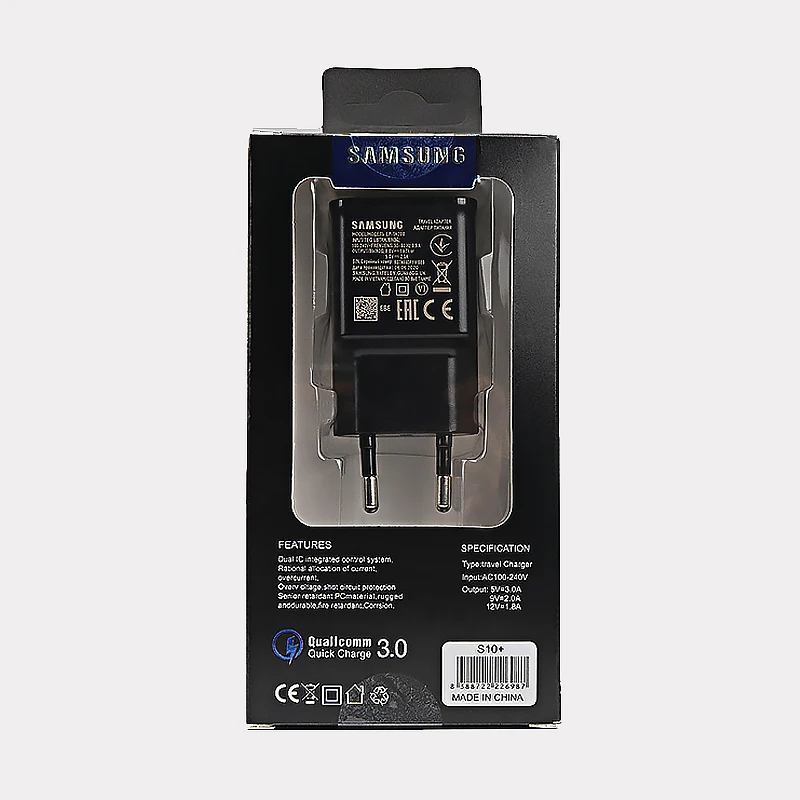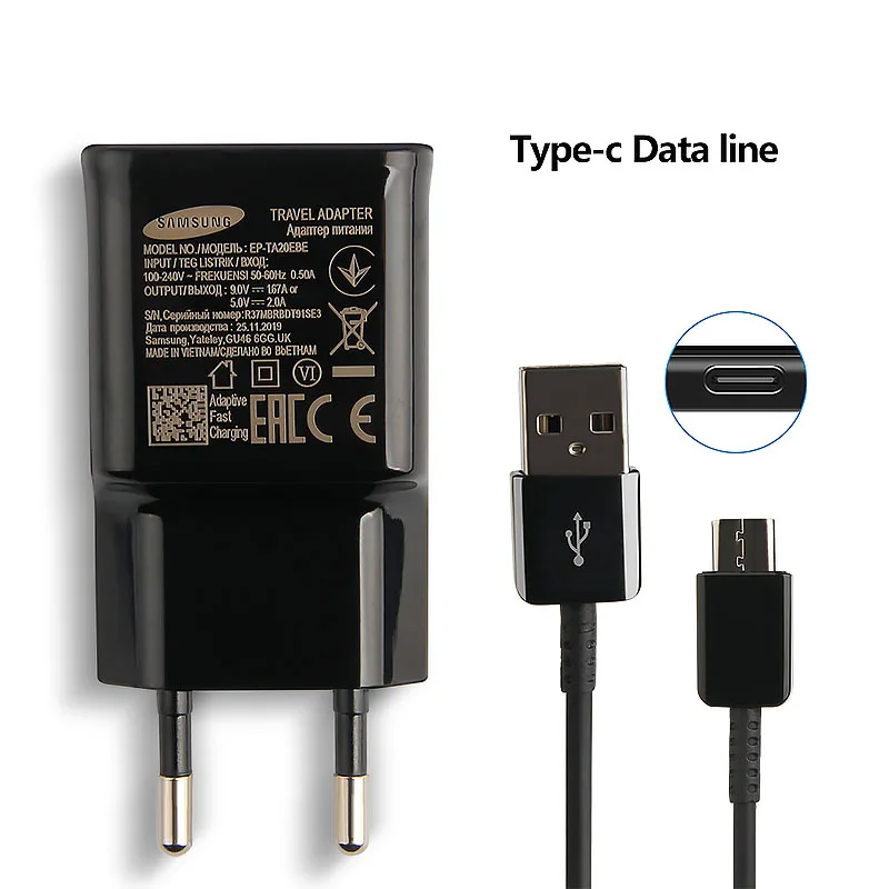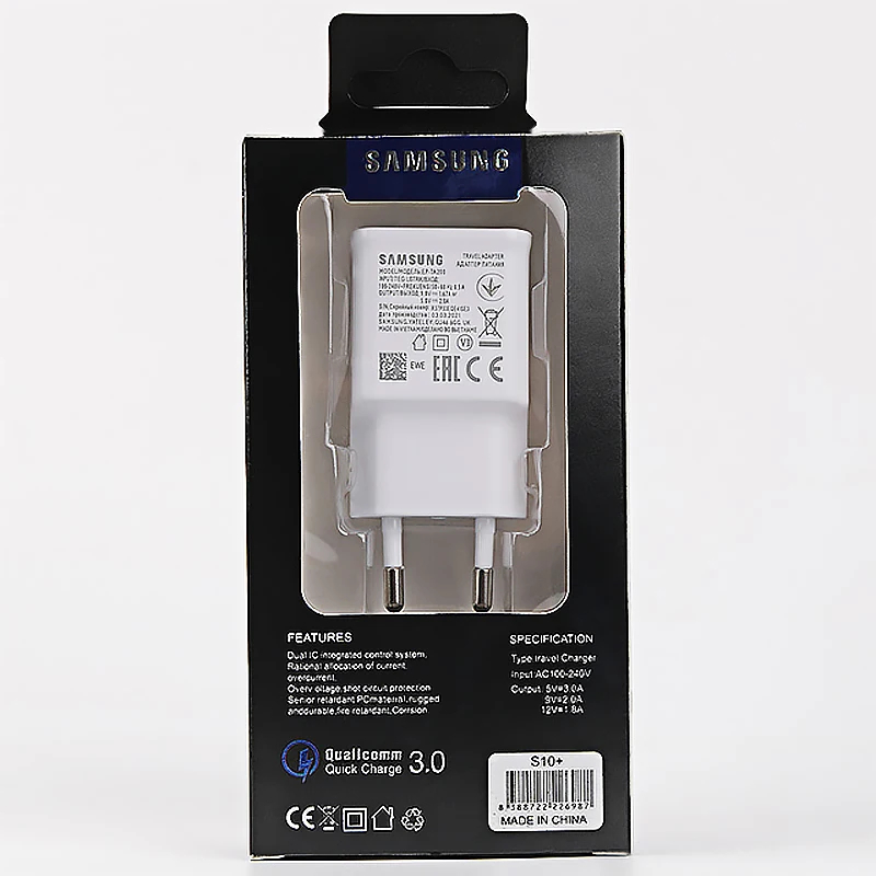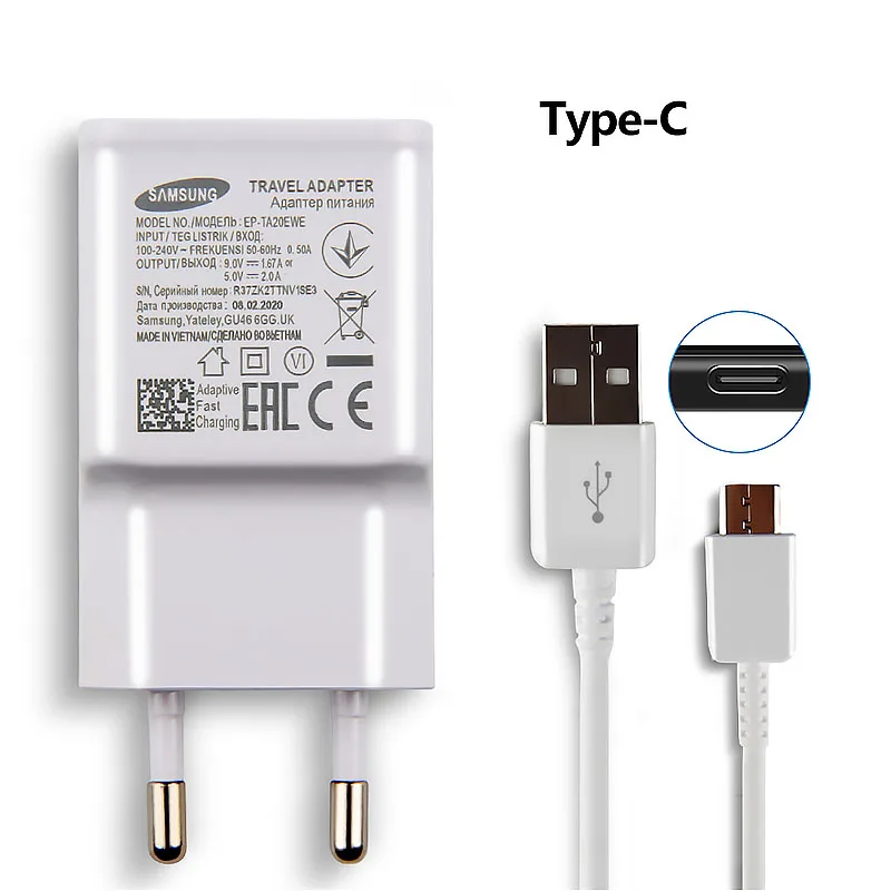 Особенности:-Оригинальный адаптер для быстрой зарядки USB с разъемом EU/US-- Выход: 5 В/2A 9V1.67A-Оригинальный кабель типа C 100 см-Подходит для всех телефонов Samsung с портом для зарядки типа C