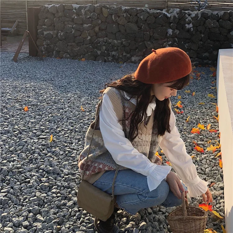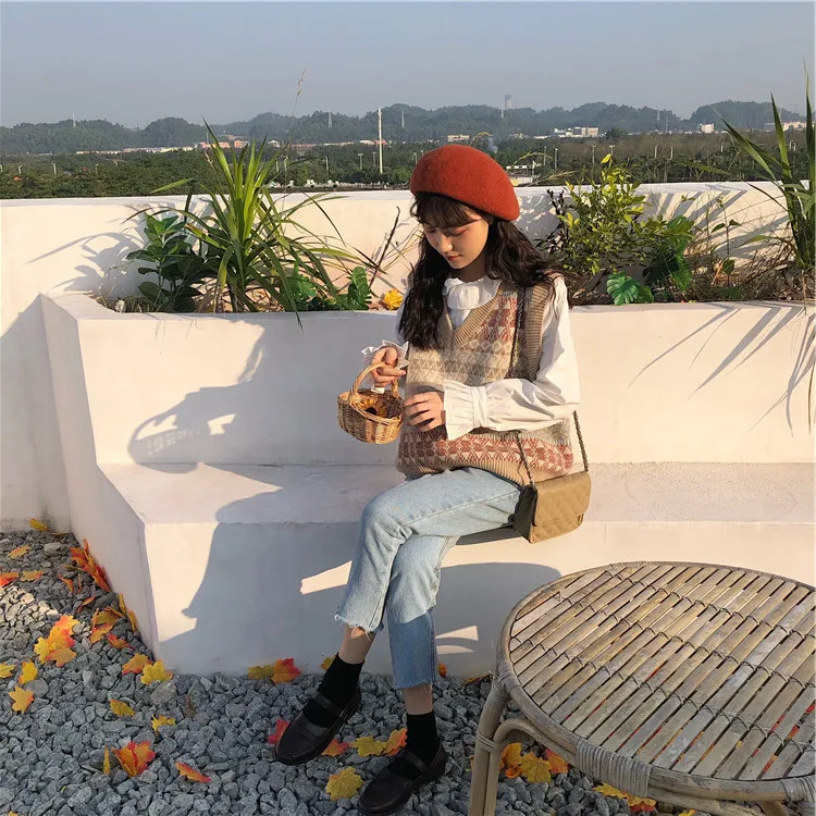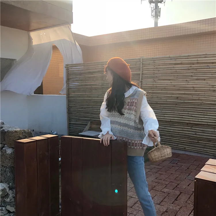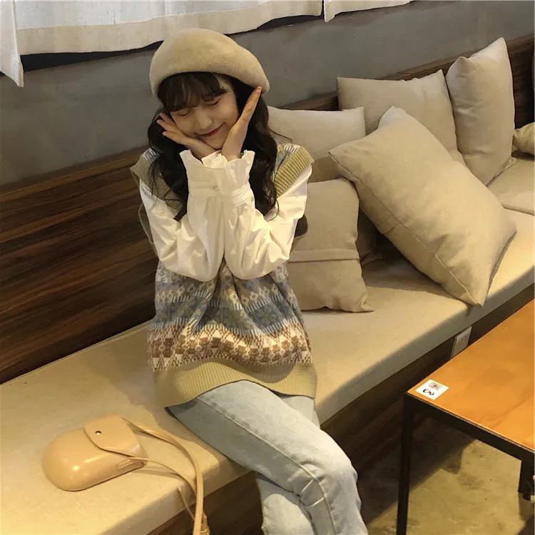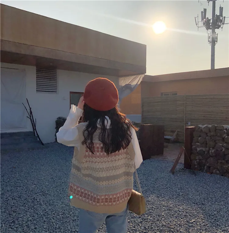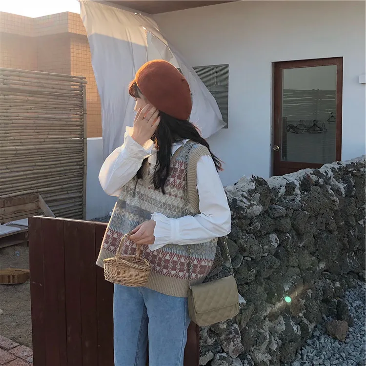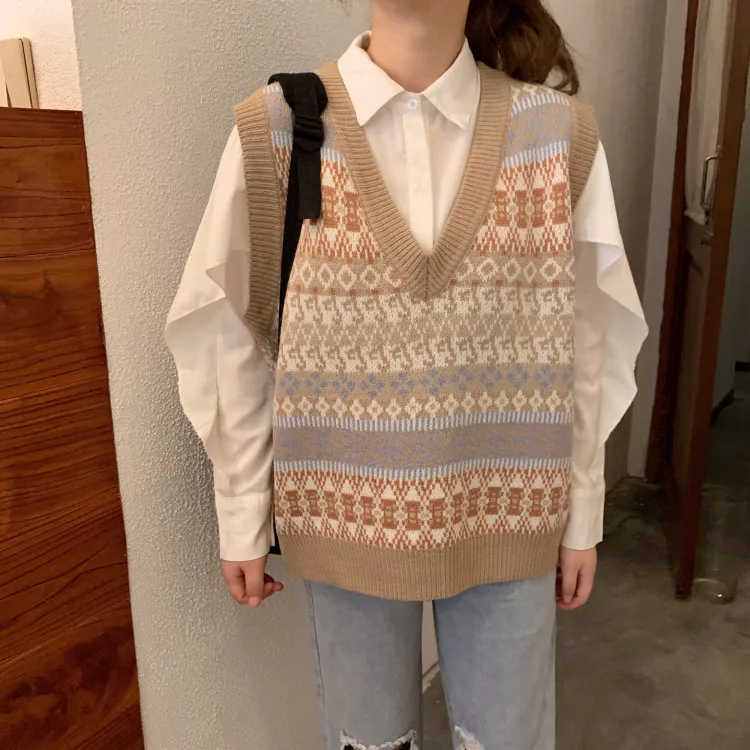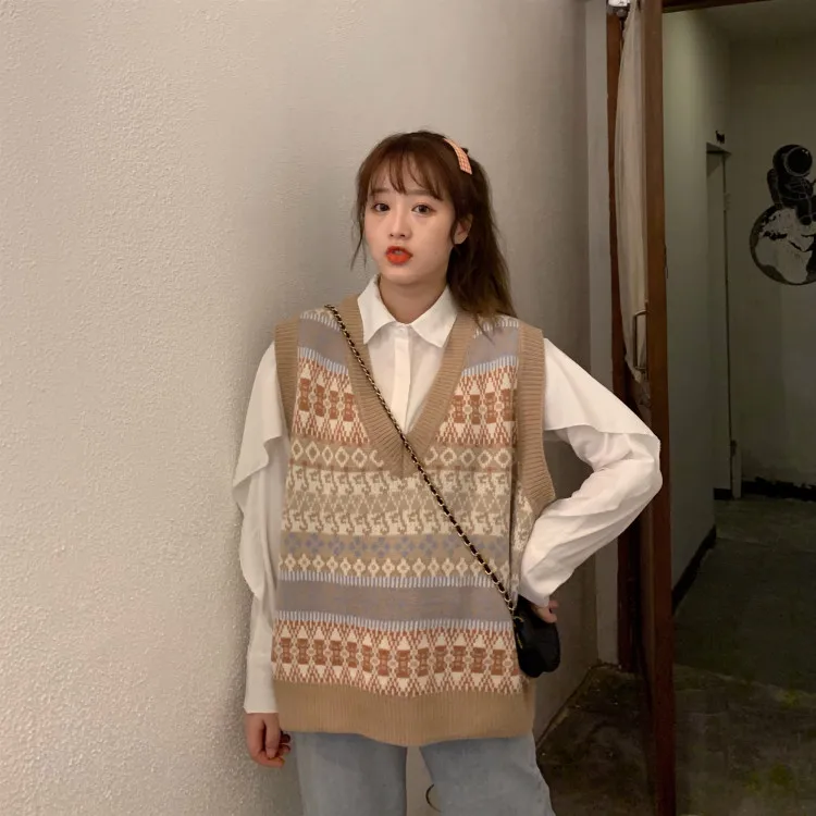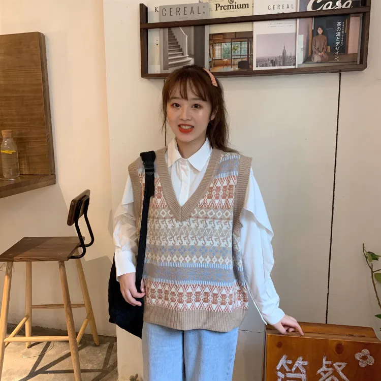 Женский свободный свитер без рукавов, винтажный вязаный свитер с узором ромбиками и V-образным вырезом, жилет, пуловер, повседневный вязаный жилет большого размера в Корейском стиле на осень