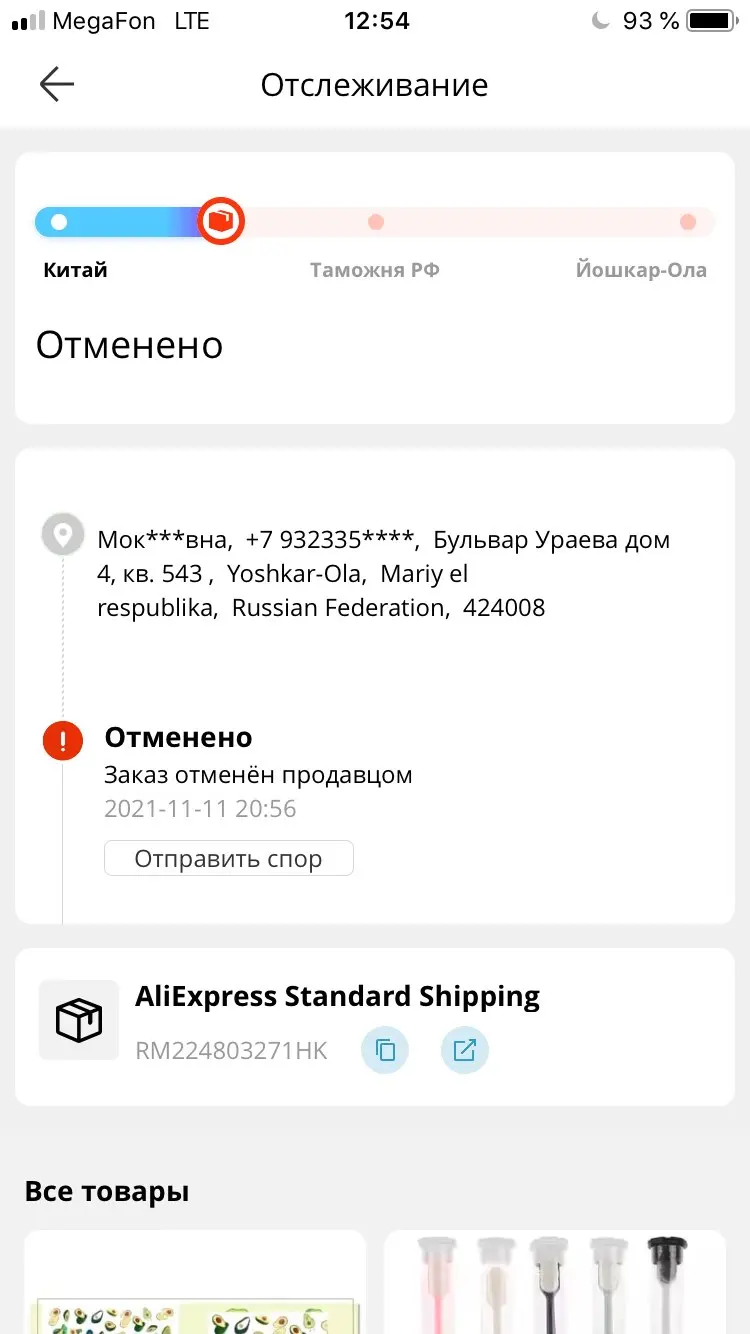 Товар не был отправлен, неправильный номер отслеживания. Вернули деньги.