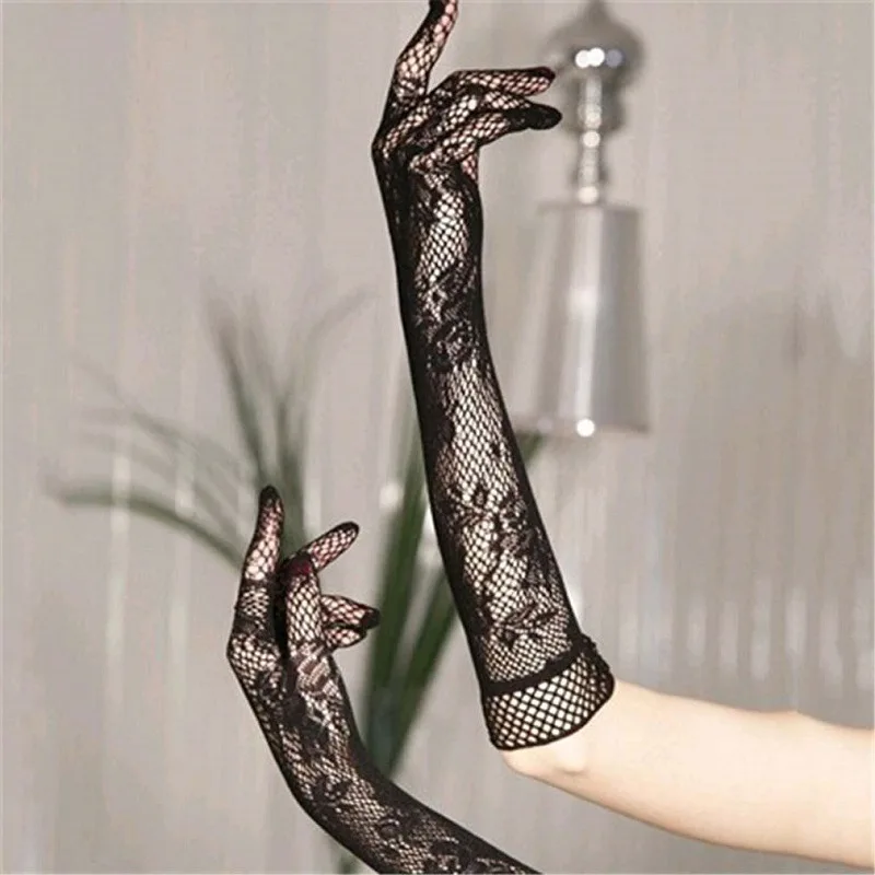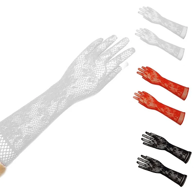 Элегантные женские эластичные кружевные сетчатые перчатки с декором для ужина, женские ультратонкие длинные пикантные красные солнцезащитные перчатки