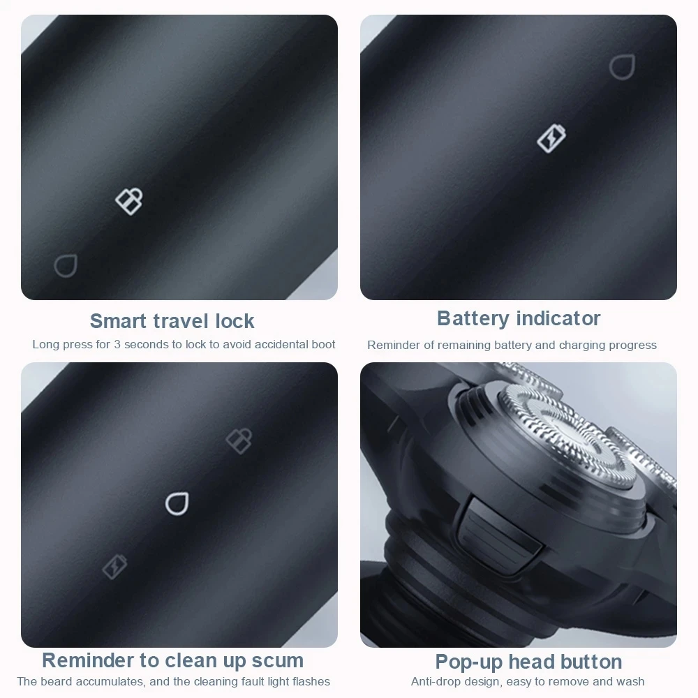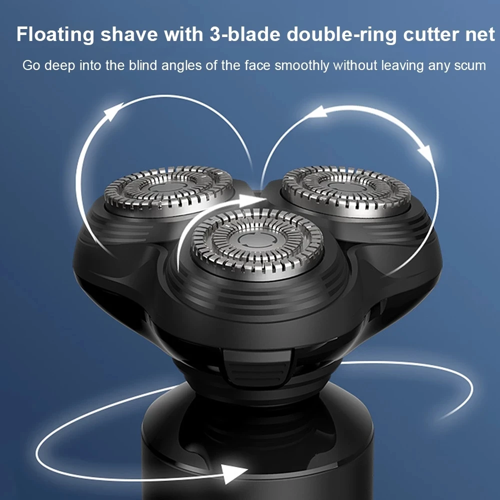 1: трехголовое плавучее Бритье2: плоское двойное кольцо нож сетка3: интеллектуальная защита от обрезания4: IPX7 водонепроницаемый5: трехминутная вспышка6: длительная выносливость 90 минут