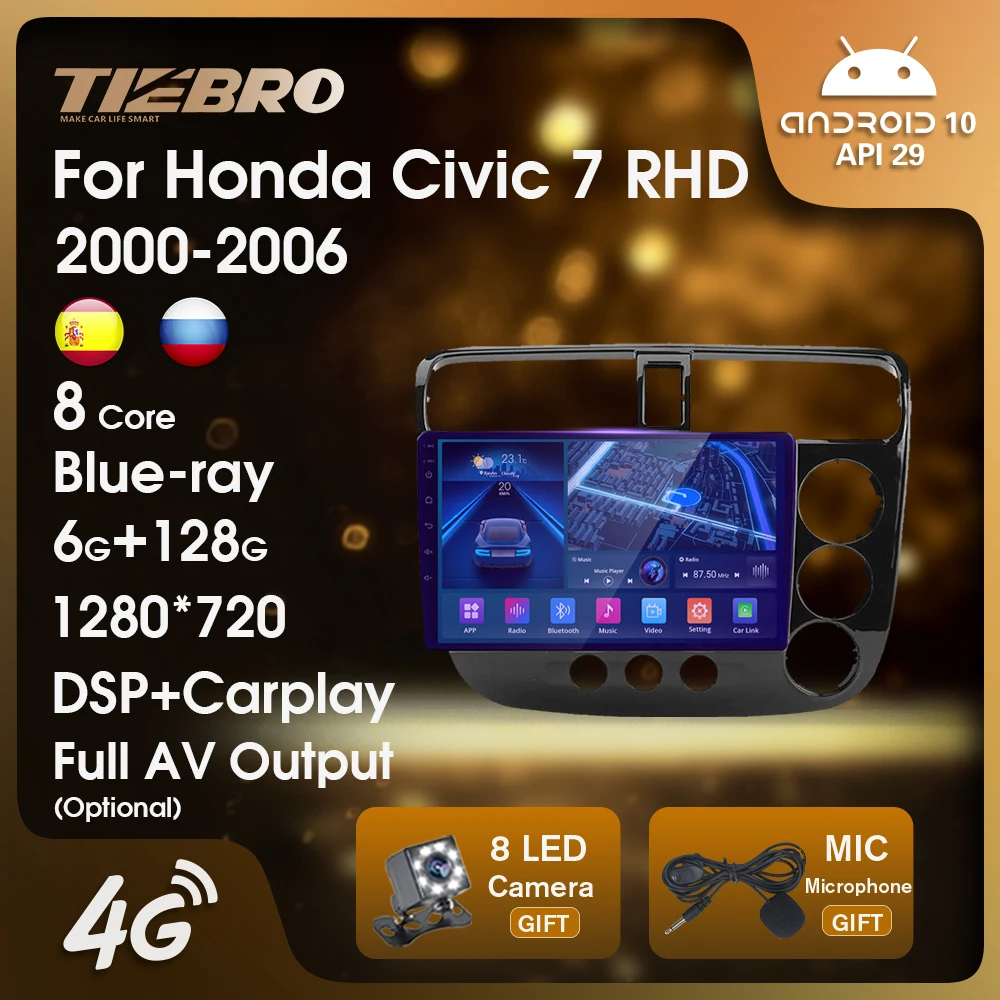 Автомагнитола TIEBRO для Honda Civic 7 RHD 2000-2006 Blu-Ray IPS QLED 2Din Android 10 Автомобильный мультимедийный видео 1280*720P Авторадио