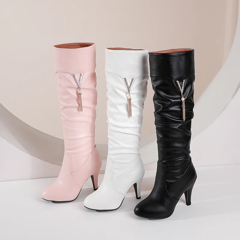 Модные сапоги до колена на платформе теплые плюшевые женские зимние длинные сапоги из искусственной кожи на высоком каблуке Zapatos Mujer черные белые сапоги