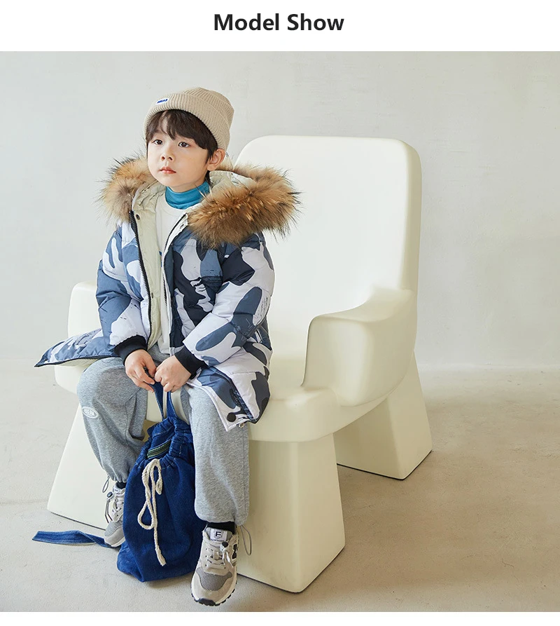 Длинное пальто с капюшоном и камуфляжным мехом для маленьких мальчи...