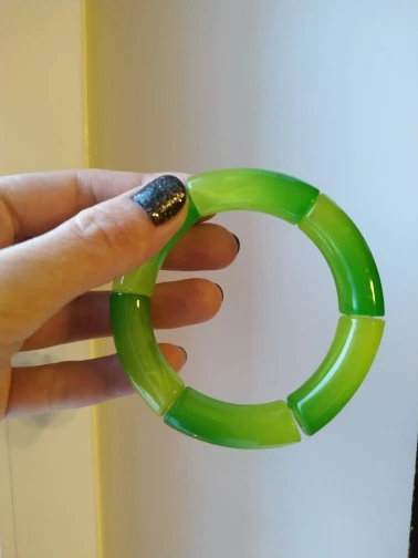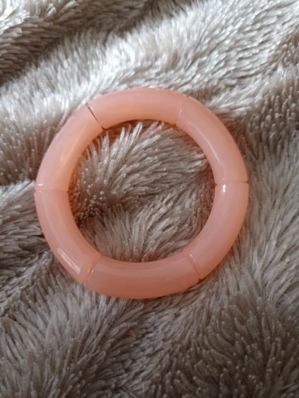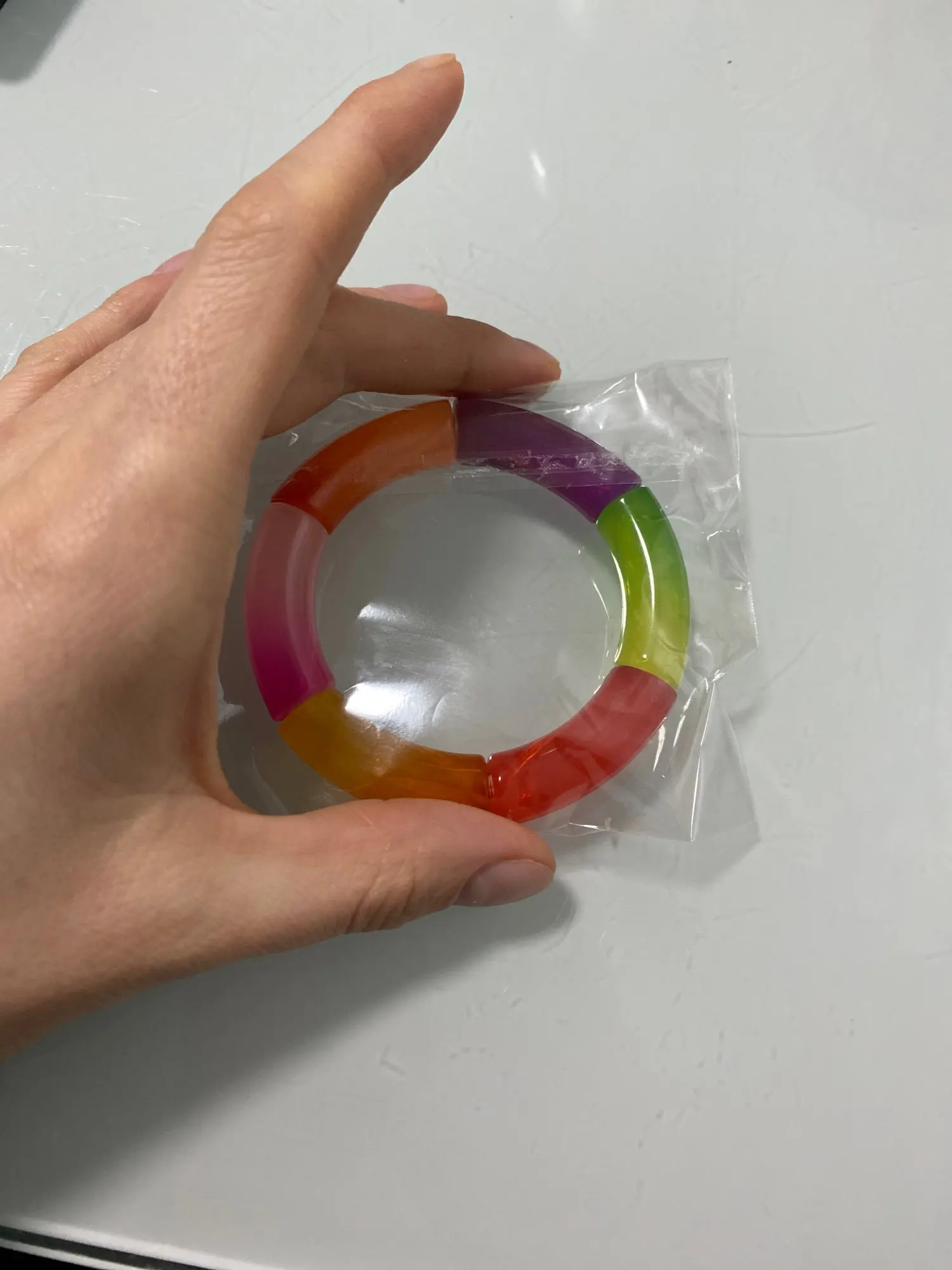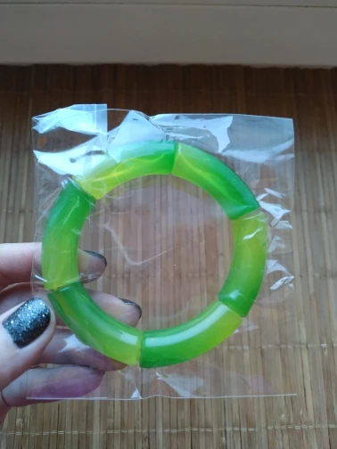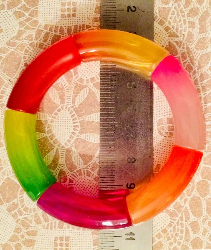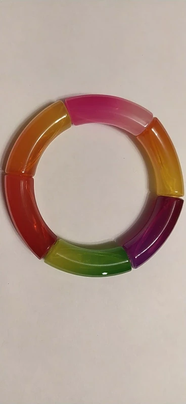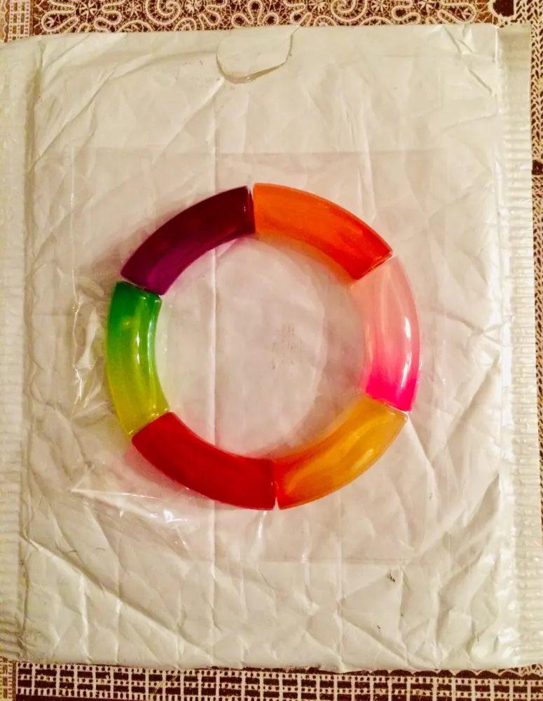 Браслетик достался за цент.Спасибо!Доставка бесплатная и недолгая.Необычный,летний,детский,разноцветный браслетик.Состоит из 6 бубликов,нанизанных на растягивающийся шнур.Ширина акрилового бублика около 1 см.Для девочек-подростков на лето
