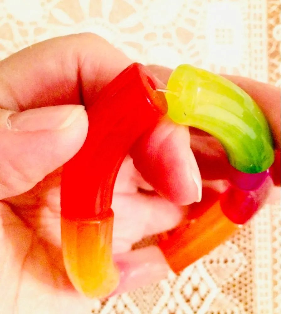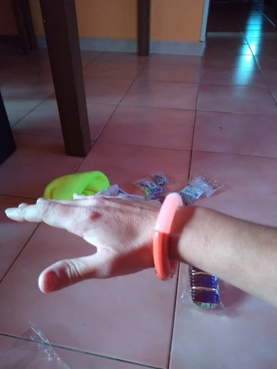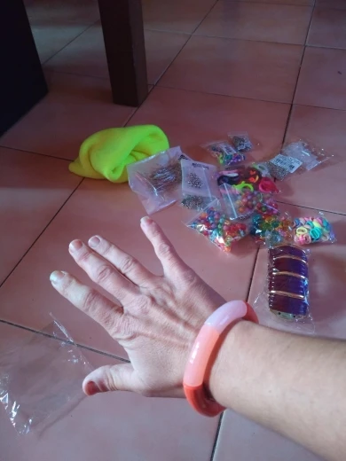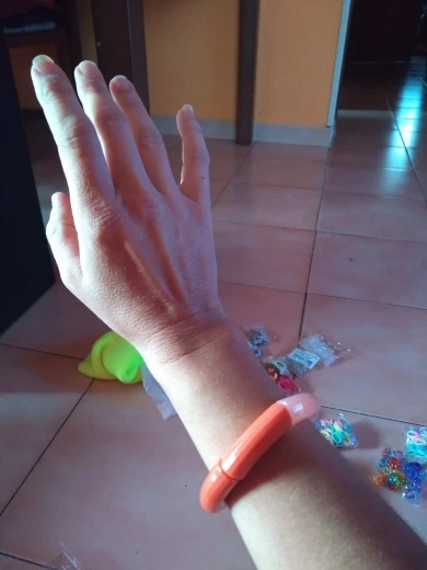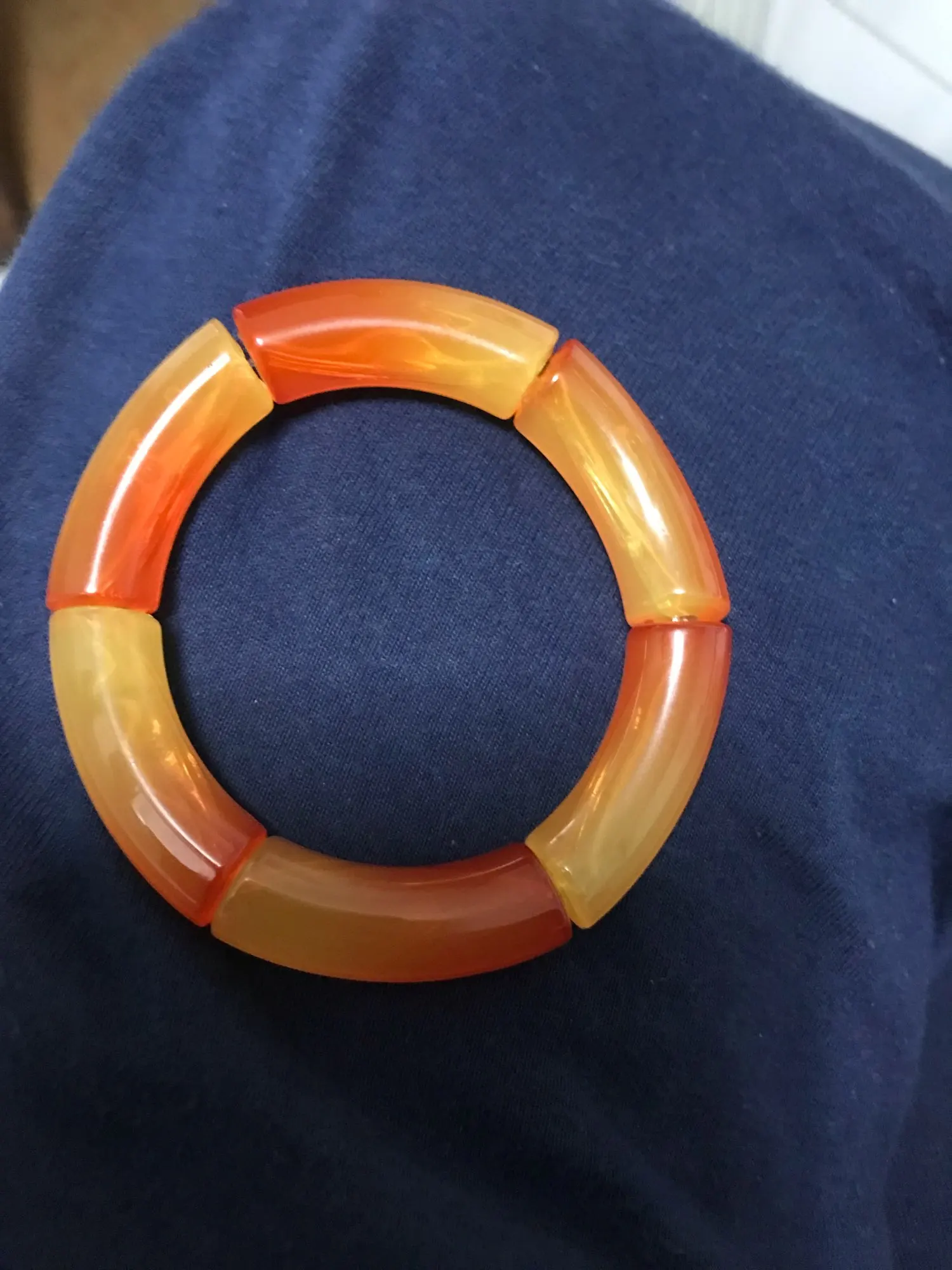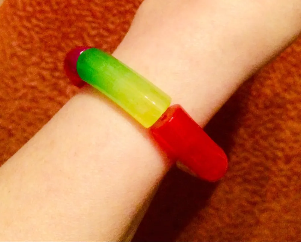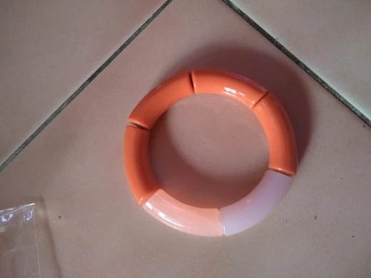 Браслетик достался за цент.Спасибо!Доставка бесплатная и недолгая.Необычный,летний,детский,разноцветный браслетик.Состоит из 6 бубликов,нанизанных на растягивающийся шнур.Ширина акрилового бублика около 1 см.Для девочек-подростков на лето