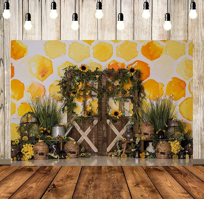 Весенние Подсолнухи деревянная дверь фон пчела день Медовый торт разбивать 1-й День рождения Фотостудия Фото фоны
