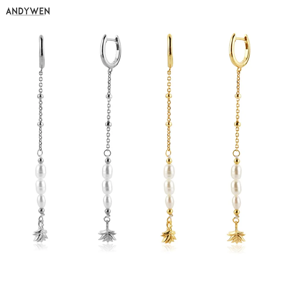 ANDYWEN 925 пробы Серебряная Золотая длинная цепочка, серьги-кольца, серьги с подвеской и золотым покрытием