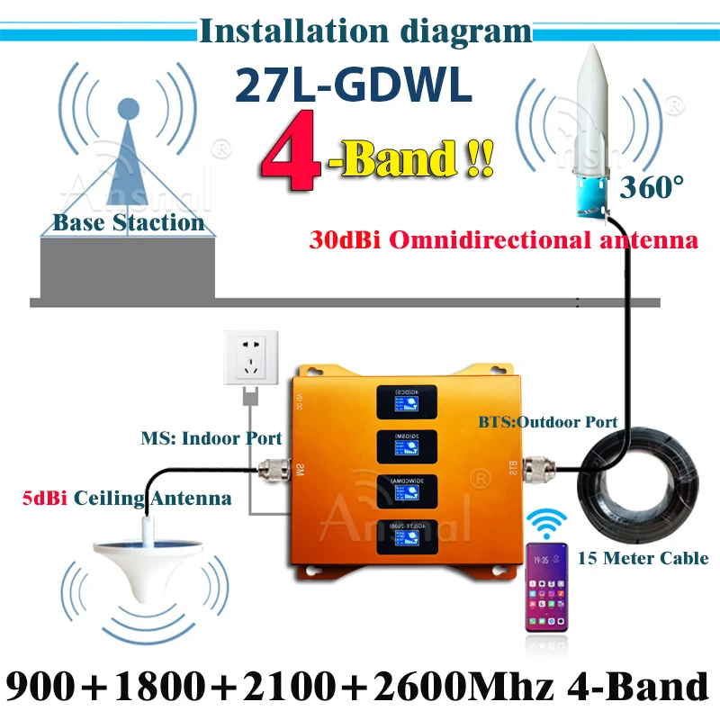 Пожалуйста, убедитесь, что вы можете получить как минимум 2 бара сигнала, который вы хотите улучшить, частота сигнала сотового телефона, который вы хотите улучшить, должна соответствовать частоте приобретенного бустера.PS: если вы хотите повысить частоту вашего телефона 900/1800/2100/2600, вы купите GSM900mhz + DCS LTE 1800MHZ + 2100mhz + 2600mhz Booster. Наружная антенна должна быть установлена в направлении базовой станции, которая может получить целевой сигнал