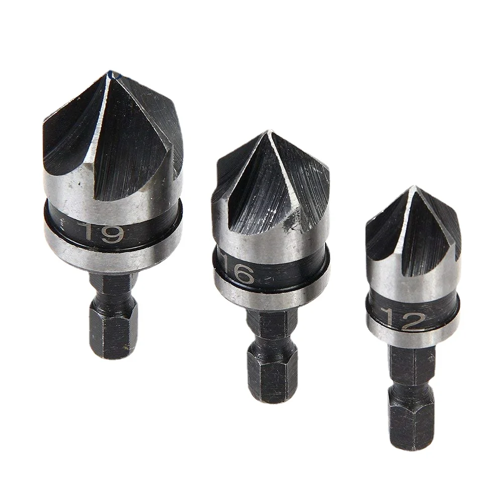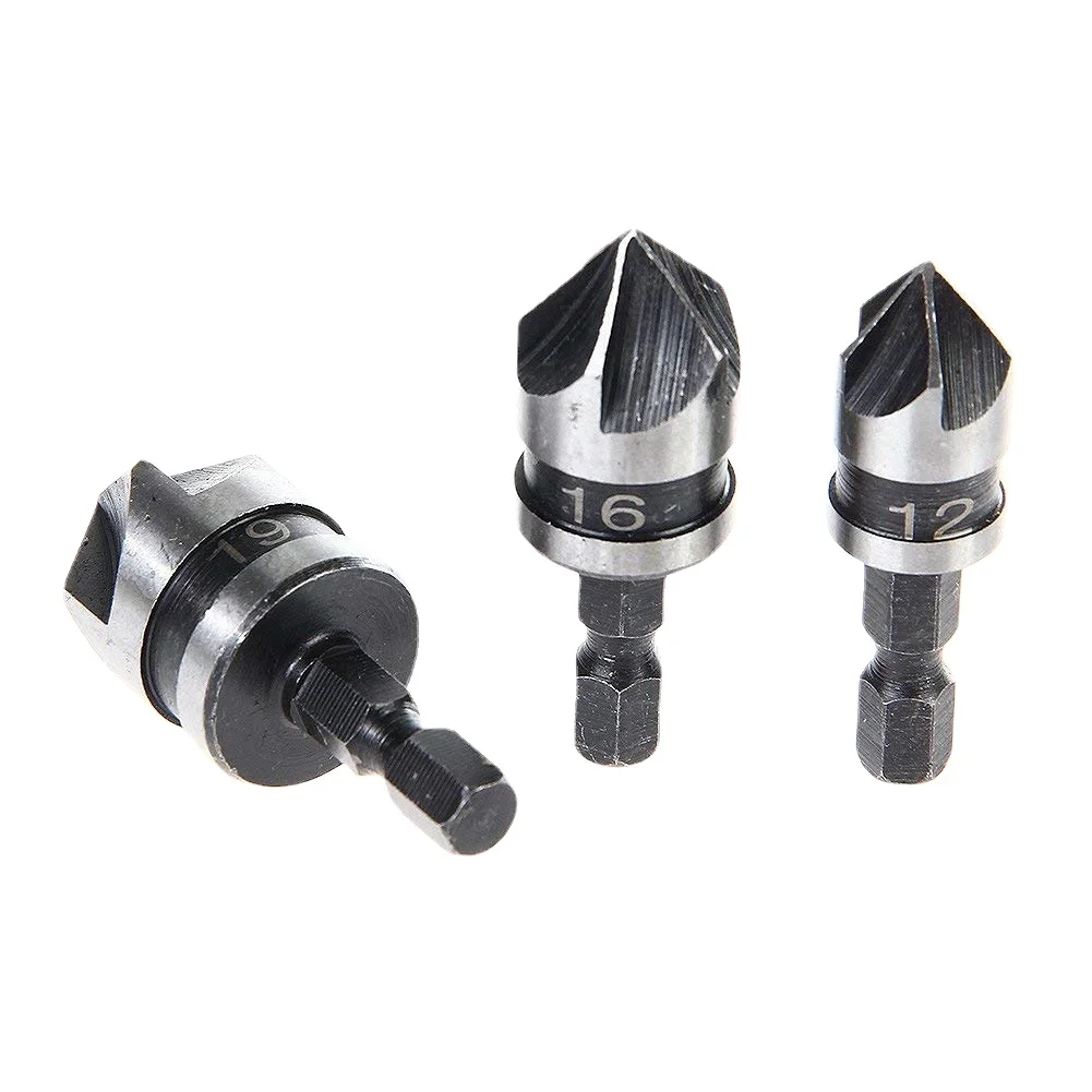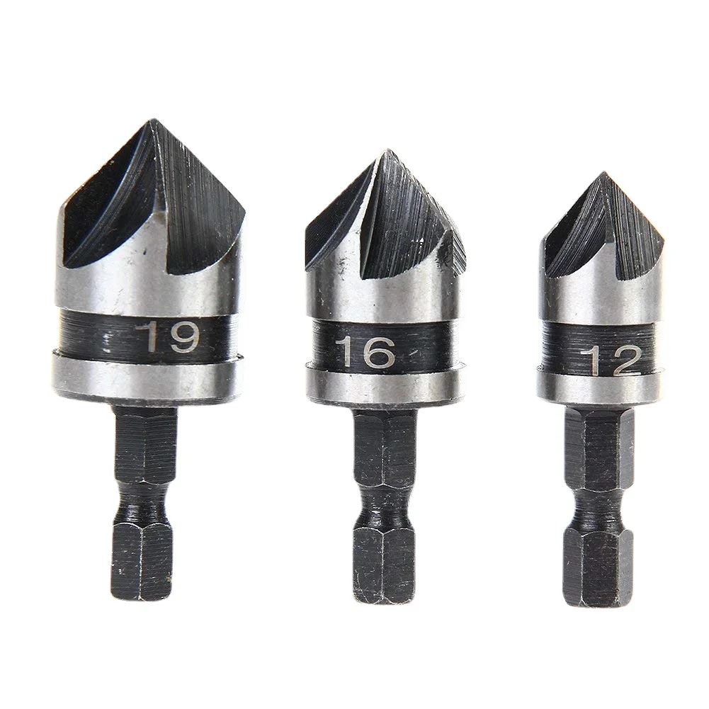 Набор сверл для зенковки, комплект из 3 сменных насадок с 5 канавками, 90 градусов, для снятия фаски, для дерева, металла, 12 мм, 16 мм, 19 мм
