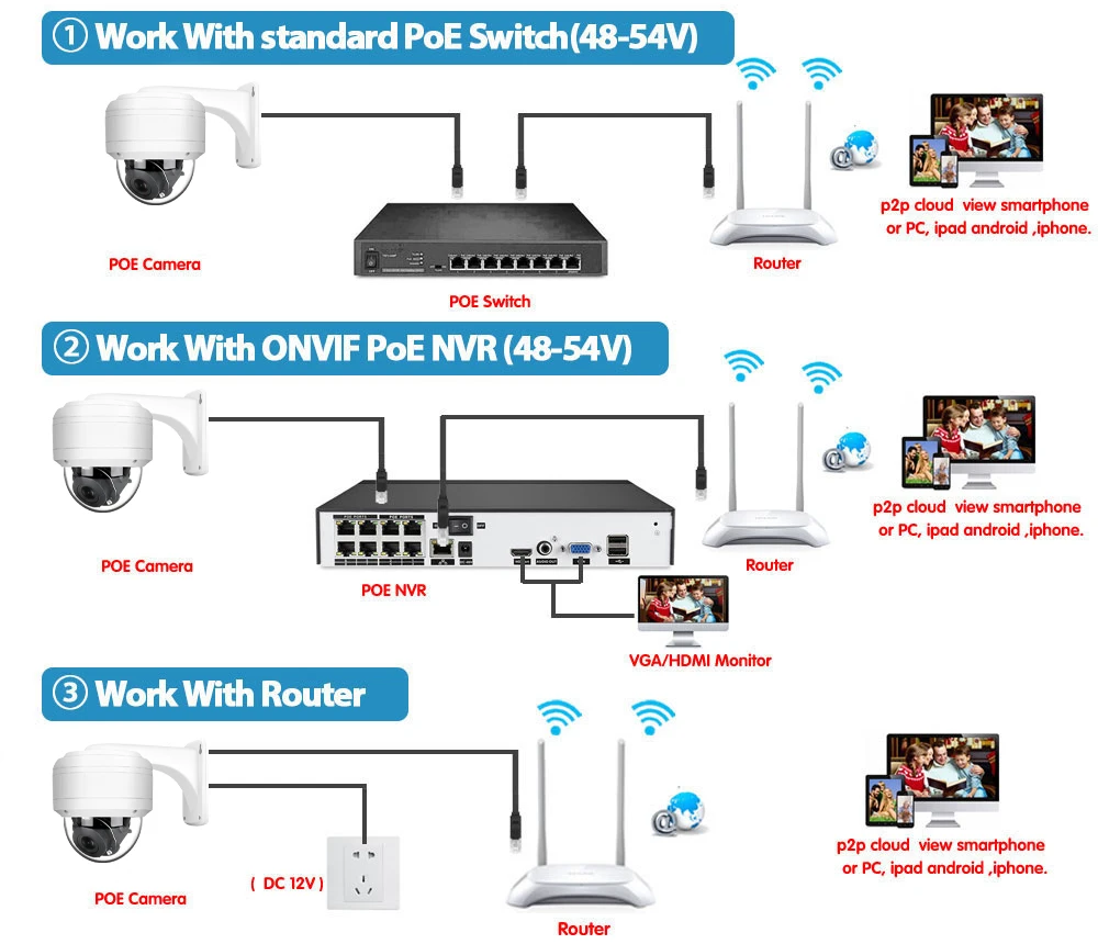 Нет дополнительных кабелей питания или адаптеров, просто подключив ip-камеру к NVR с помощью одного кабеля, вы можете легко завершить установку без знания о компьютере или сети и начать наслаждаться супер простым мониторингом среди вашего смартфона, планшета или ПК.