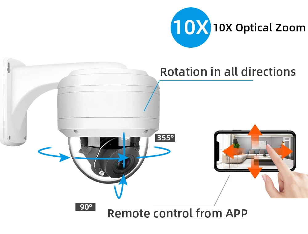 IP-камера купольная, 5 МП, IP66, PTZ, POE, 5 Мп, 10X, оптический зум, обнаружение движения, ночное видение, ИК, 80 м, аудио, CCTV, P2P
